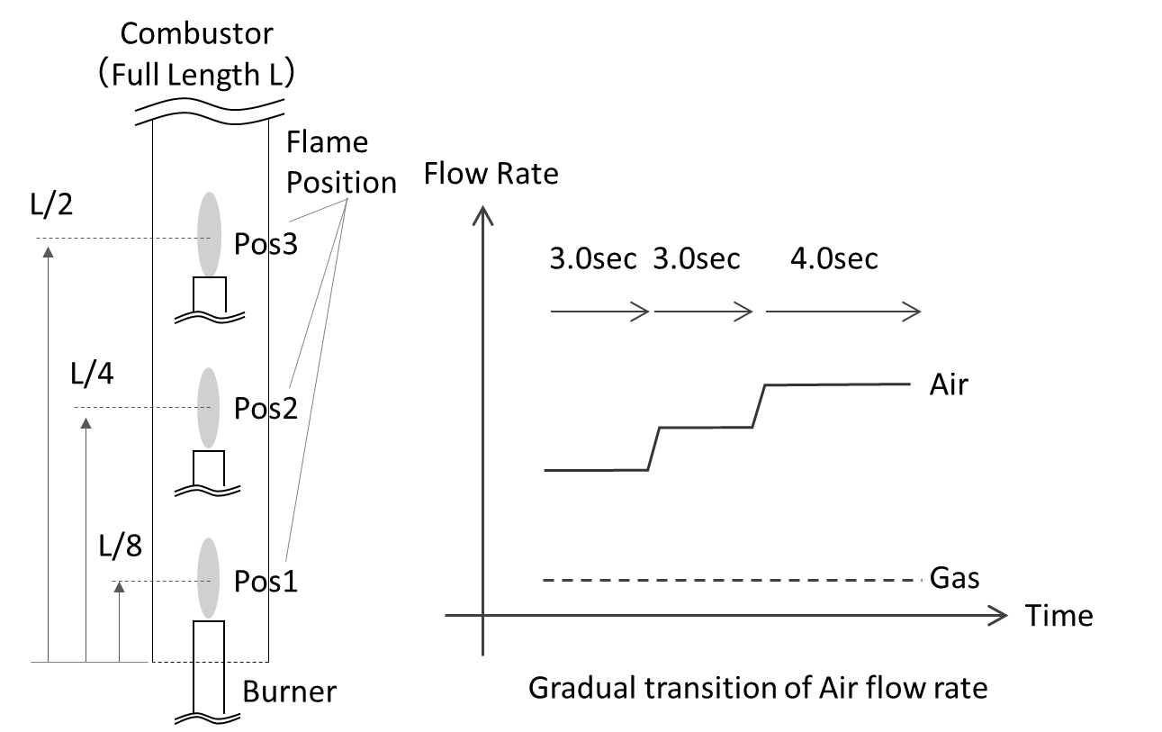 The maximum air flow rate was set to the limit conditions for flame lift and blowout, while the gas flow rate was set to the maximum allowable value considering the heat resistance of the nozzle(uncooled). As shown on the left of Figure 3.2, the nozzle was positioned at L/2, L/4, and L/8 from the bottom(upstream) end of the combustion cylinder, relative to the total length of the cylinder(L). This is because the relative position between the flame and the antinode or node of the first-order acoustic mode is believed to influence the level of combustion instability. The air flow rate was set to vary step by step, as shown in right of Figure 3.2.