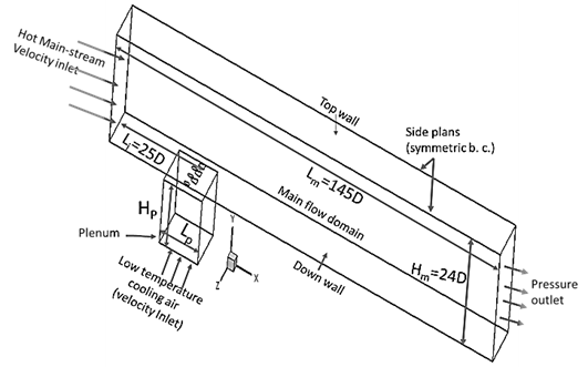 To conduct a reliable and detailed investigation of film cooling behavior, the study employs a meticulously designed computational domain that emphasizes both geometric accuracy and flow fidelity. This domain is purpose-built to resolve the complex interactions between coolant jets and the mainstream flow, particularly the influence of injection hole shape on the resulting thermal and fluid dynamic fields. As illustrated in Figure 1, the simulation is carried out within a fully three-dimensional domain that realistically replicates the physical setup under consideration. Central to this configuration is the use of Laid-Back Fan-Shaped Injection Holes (LFIHs), a geometry known for promoting enhanced lateral coolant dispersion. These injection passages are seamlessly embedded between two critical regions: an upstream plenum chamber and the main flow duct. This integrated layout ensures a continuous and representative simulation of coolant delivery from the reservoir to the hot gas path. The entire computational domain is logically divided into three primary zones: the plenum chamber, which acts as the coolant reservoir; the injection tubes, through which the coolant is delivered; and the main flow channel, where coolant–mainstream interaction and surface cooling occur. The geometric and boundary configurations of these regions are carefully depicted in Figure 1, providing a comprehensive visualization of the model structure. To facilitate generalization and simplify analysis, all dimensions are expressed in non-dimensional terms, normalized by the diameter of the injection hole. These normalized values are clearly summarized in Table 1, allowing for scalability and ease of comparison across different operating conditions or geometrical configurations.