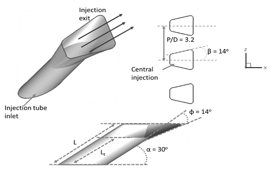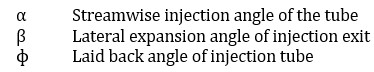 Figure 2 presents the coolant injection schematic used in the film cooling analysis, featuring a single row of three Laid-Back Fan-Shaped Injection Holes. These holes are arranged with an inter-hole pitch (P) of 3.2D, ensuring uniform spacing. The region of interest within the computational domain is carefully defined, extending laterally from Z/D = -1.4 to 1.4 and axially from X/D = 0 to 100, allowing for comprehensive analysis of flow dynamics and coolant film dispersion. Each injection hole is oriented at an inclination angle (α) of 30°, with a streamwise laid-back angle (ɸ) of 14° and a lateral expansion angle (β) of 14°. Figures 1 and 2 collectively provide a detailed view of the injection tube’s integration with the main flow domain, including the throat length (Lt) and total injection length (L). The geometric design promotes effective lateral spreading and enhances the surface coverage of the coolant film, thereby improving overall film cooling effectiveness.