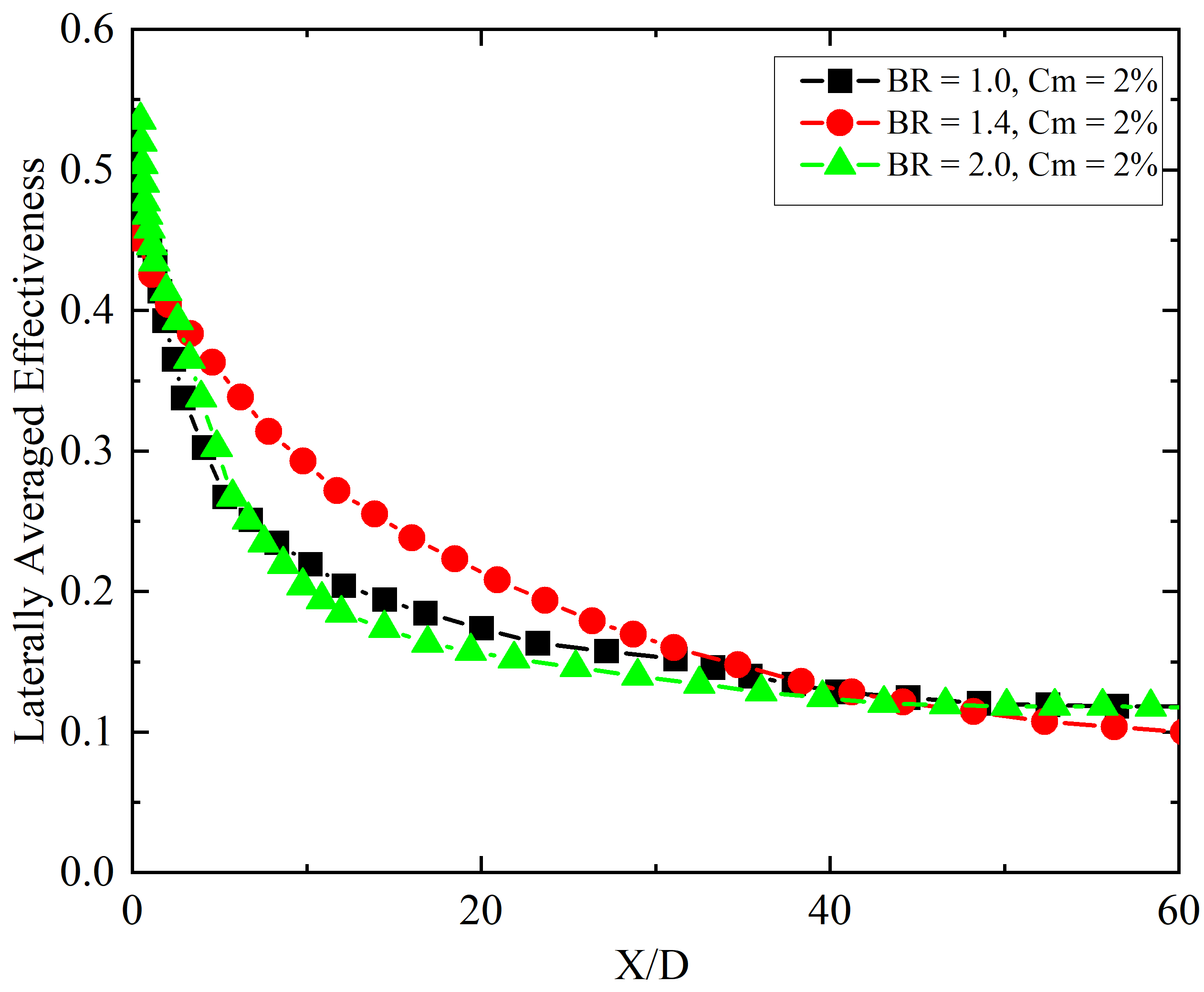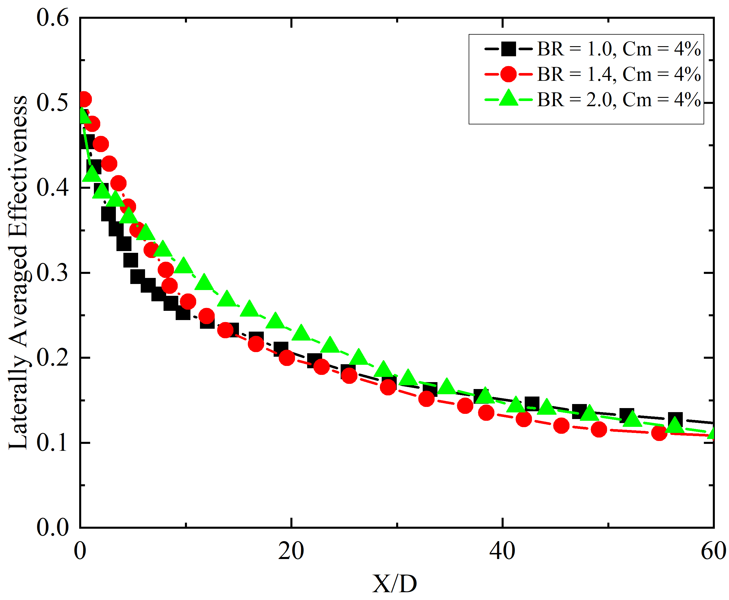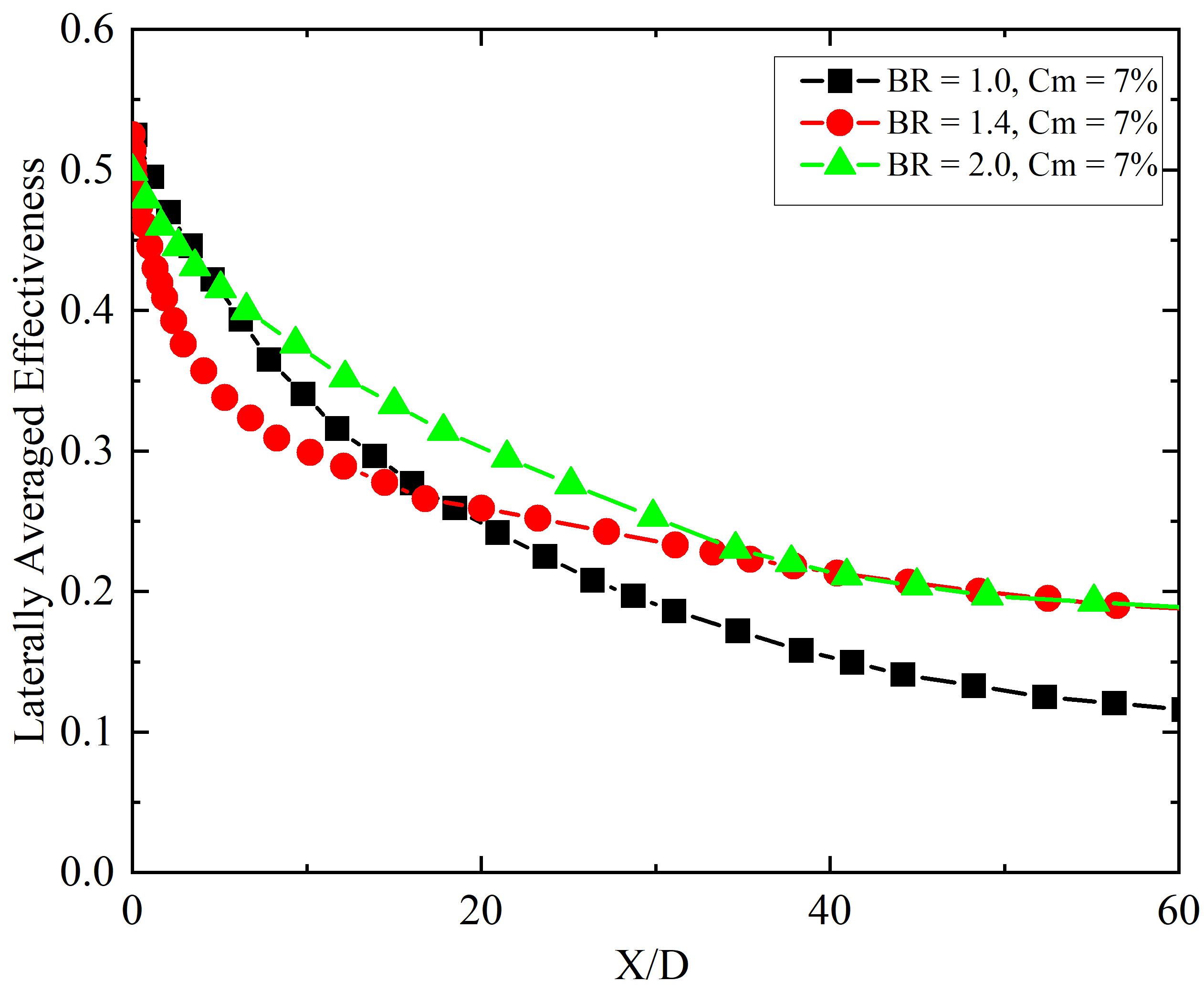 - At Cm = 7%, a BR of 1.4 achieves the highest area-averaged effectiveness, showing a 17% improvement due to the balanced momentum ensuring better film adhesion and lateral spreading.
