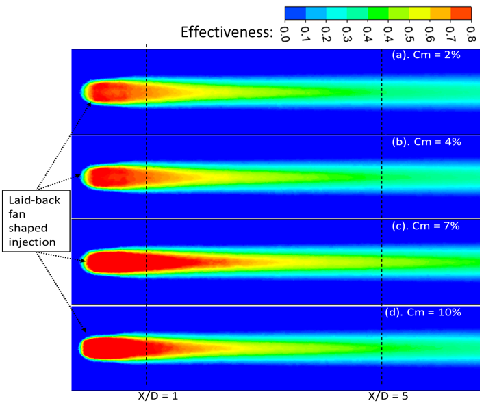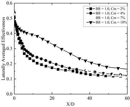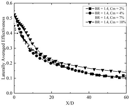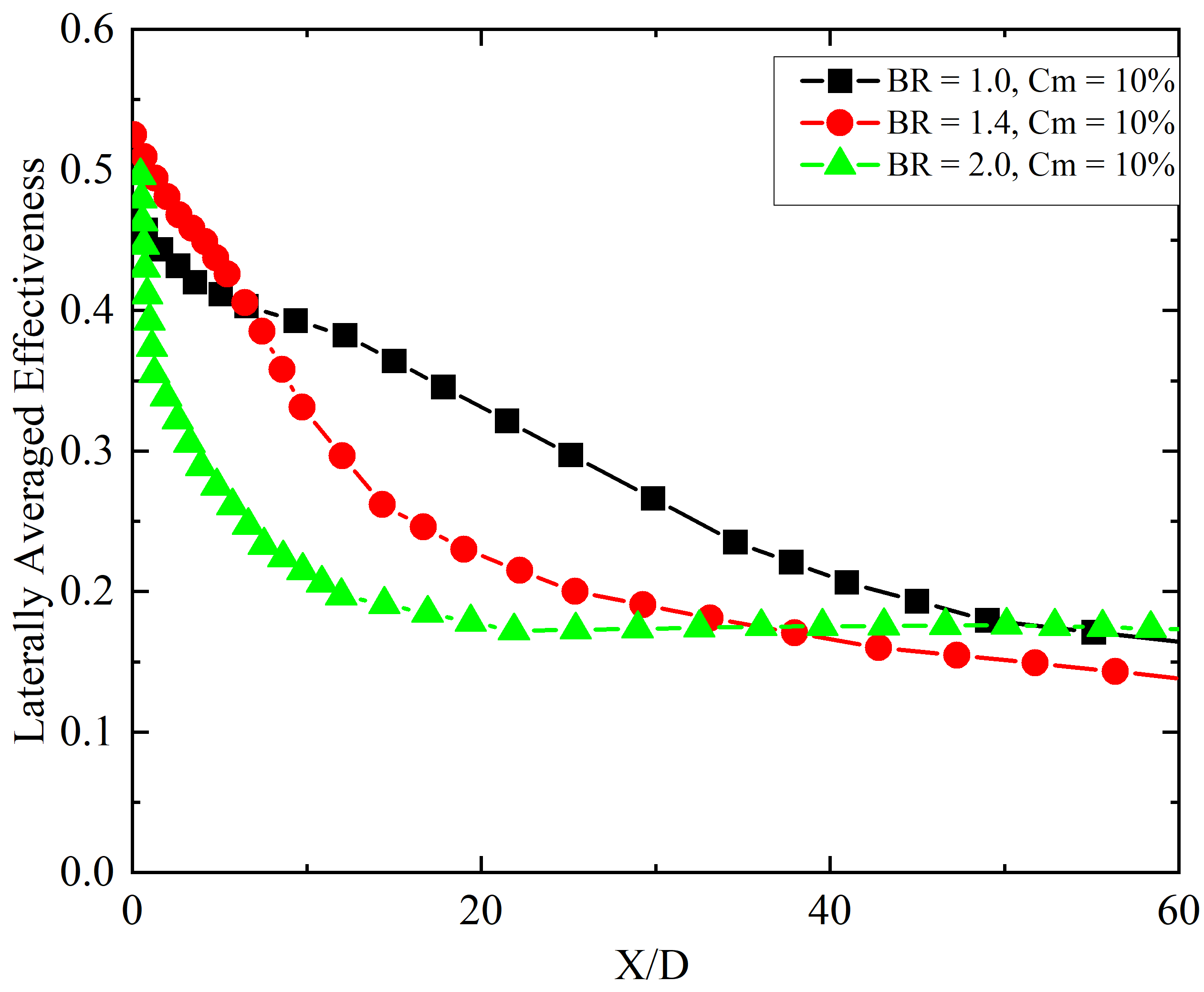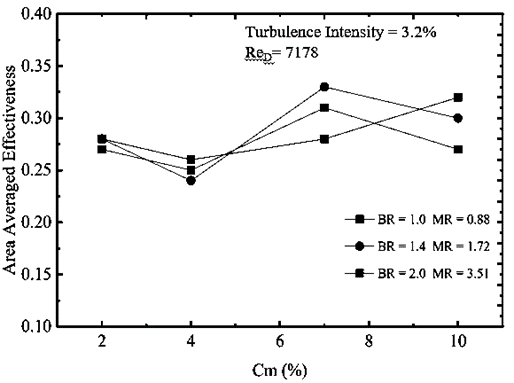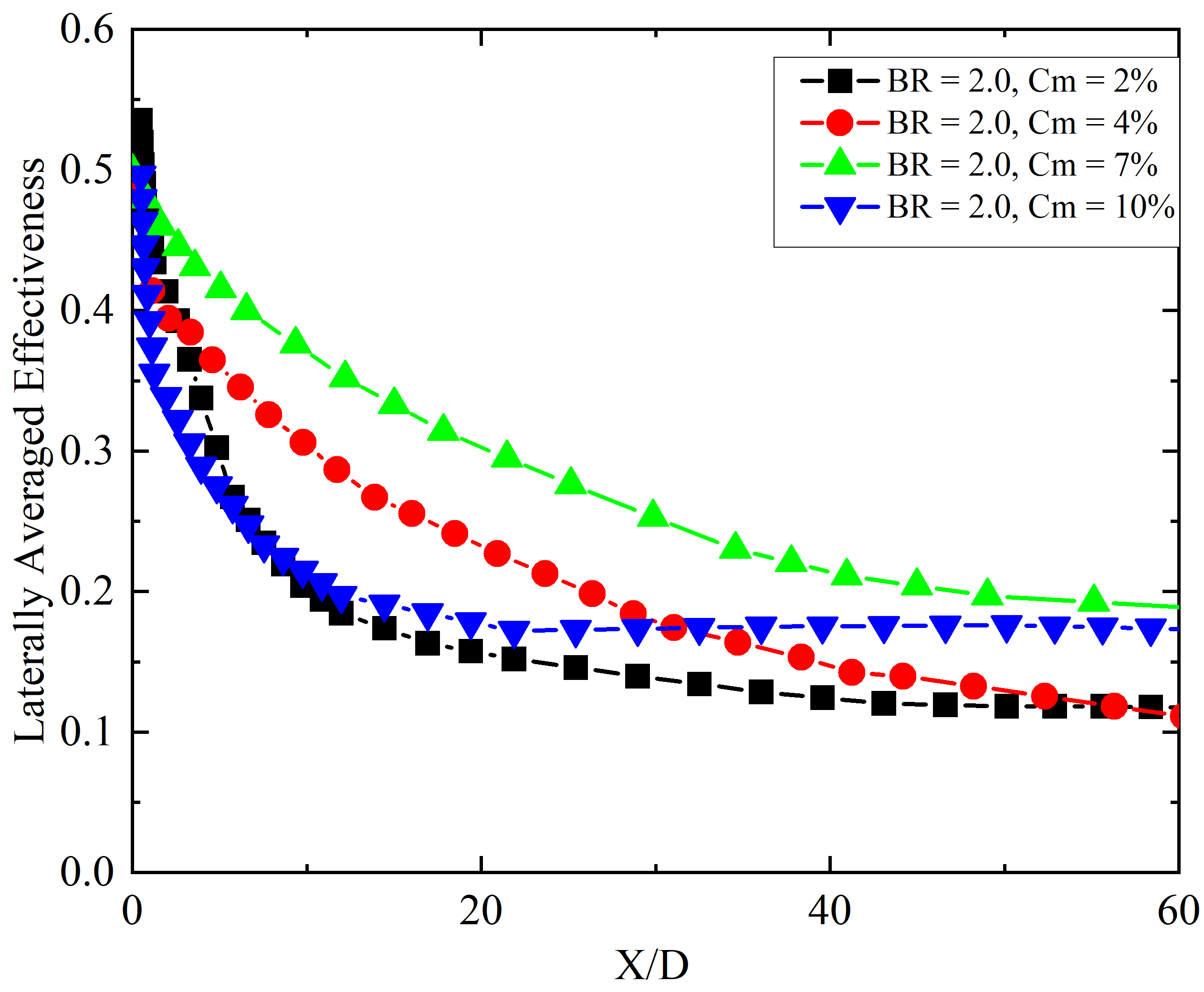 - At Cm = 7%, a BR of 1.4 achieves the highest area-averaged effectiveness, showing a 17% improvement due to the balanced momentum ensuring better film adhesion and lateral spreading.