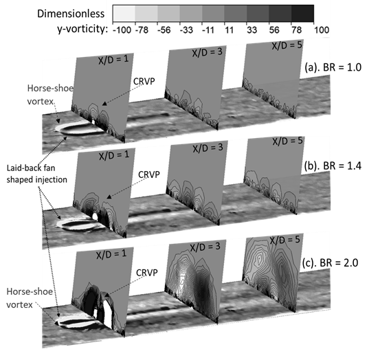 Figure 22 shows vortical structures, including hanging vortices near the trailing and lateral edges of the LFIH. These vortices exhibit alternating signs of y-vorticity, with relatively low vorticity between them, leading to reduced mixing and narrower lateral dispersion. At lower BRs (e.g., 0.2 and 0.6), this behavior allows the coolant to spread laterally over short streamwise distances. As BR increases, the CRVPs elongate, and at BR = 2.0, secondary CRVPs are also observed above the main vortex cores. These CRVPs are associated with high-mixing zones that promote lateral separation of the coolant film, resulting in a thinner film near the hole exits for BR = 1.4 and 2.0. The findings highlight that vortex formation directly impacts coolant dispersion, BR = 2 promotes wider lateral spreading via edge vortices, while BR = 1 induces complex interactions involving CRVPs and tube vortices that significantly affect mixing behavior and cooling performance.