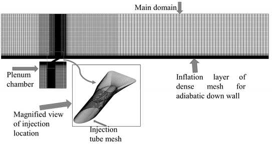 A structured hexahedral computational grid comprising approximately 2.5 million elements was generated using ICEM-CFD to accurately represent the flow domain associated with LFIH. The mesh design ensures topological consistency and smooth transitions across all three major regions of the computational domain: the main flow duct, the injection tubes, and the plenum chamber, as depicted in Figure 3. Special attention was given to mesh refinement near the coolant injection region, particularly around the hole exit, where high-velocity gradients, flow separation, and thermal mixing are expected to occur. These injection apertures have an inlet diameter (D) of 6.35 mm, and the injection tube extends to a length of 3D, as detailed by Ragab and Wang [22]. These apertures were oriented at an inclination angle of 30°, with laid-back and lateral expansion angles of 14° each, to promote lateral spreading of the film. The mesh around the hole exit and film region was designed with non-uniform cell sizing and inflation layers, ensuring finer resolution close to the flat adiabatic surface. These inflation layers help capture near-wall phenomena such as the viscous sublayer and thermal boundary layer, essential for resolving convective heat transfer accurately. The first layer thickness was calculated based on a target y+ value of less than 1, using the expression: