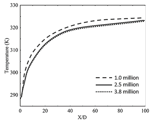 A grid sensitivity analysis was carried out to ensure mesh independence, as illustrated in Figure 4. The comparison across multiple grid densities revealed minimal variation in wall temperature and cooling effectiveness, indicating that further refinement would not significantly impact accuracy. Based on this evaluation, Grid No. 2, comprising approximately 2.5 million structured hexahedral elements, was selected for all subsequent simulations due to its optimal balance between computational efficiency and numerical accuracy. This grid also provided sufficient resolution near the wall and hole exit regions, capturing critical gradients in velocity and temperature without compromising solver stability.