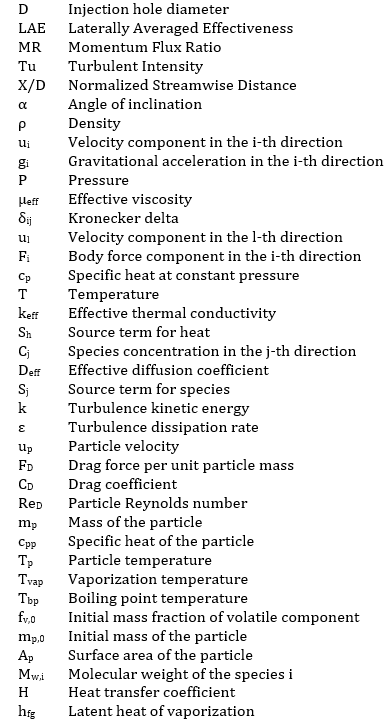 The governing transport equations consist of the incompressible mass conservation, momentum, and energy equations, with gas properties assumed to remain constant throughout the domain. In the Discrete Phase Model (DPM) simulations, drag forces acting on the droplets result in momentum exchange between the dispersed and continuous phases, altering the overall flow field. These interactions are incorporated into the Eulerian domain as source terms (DPM sources), enabling the solver to capture the influence of droplet dynamics on the gas phase accurately A coupling is established between the unsteady DPM and the steady-state Eulerian phase due to the continuous particle injection. The simulation follows a Eulerian-Lagrangian framework, where the fluid phase is solved using the Navier–Stokes equations, and individual droplets are tracked through a Lagrangian approach, allowing for a detailed evaluation of droplet trajectories, residence time, and interactions with the cooling surface. To resolve turbulence, the realizable k–ε model is employed. This model offers a robust prediction of turbulent transport and dissipation, particularly for complex flows involving jet-in-crossflow interactions and recirculation typical in film cooling configurations. To enhance numerical accuracy and reduce discretization error, especially in regions with steep gradients (e.g., near the wall or jet exit), a second-order upwind scheme is applied for spatial discretization to approximate the variable at the cell face: