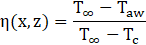 where T∞ is the freestream (mainstream) temperature, Taw is the adiabatic wall temperature, and Tc is the coolant temperature. This definition uses the freestream temperature as the reference to quantify how effectively the coolant protects the surface from hot gas exposure.