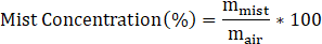 where mist concentration (%) is the mass fraction of water droplets in percentage form. mmist is the mass flow rate of water droplets, representing the mass of water droplets in the air stream. mair is the total mass flow rate of the air, representing the total mass of air flowing in the system.