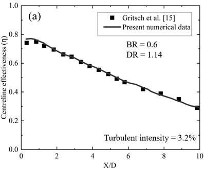 The validity of the present numerical study is assessed through a comparative analysis with experimental data from Gritsch et al. [15], which investigated LFIH using air as the coolant. This comparison is essential for evaluating the capability of the selected turbulence model to accurately capture the complex physics of the film cooling process. As illustrated in Figure 5, the numerical results show good agreement with the experimental data in terms of both centerline effectiveness and laterally averaged film cooling effectiveness.