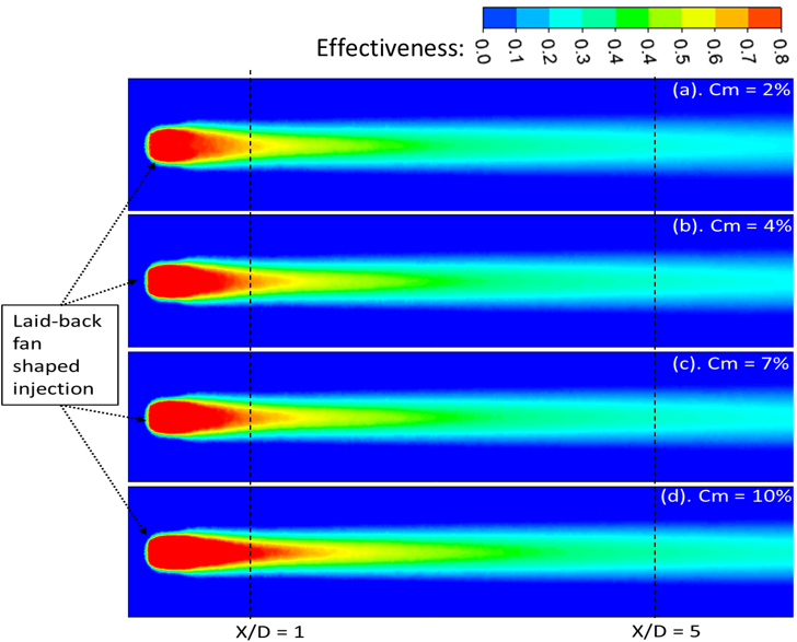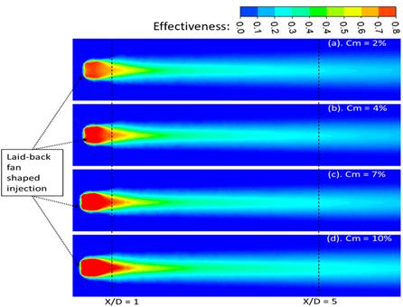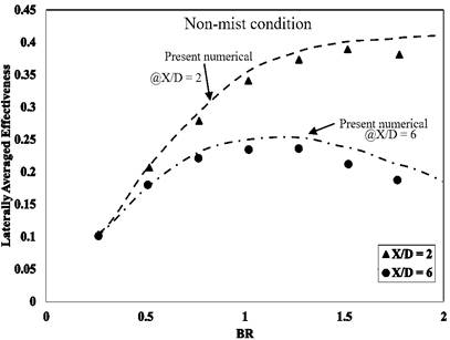 - At higher Cm = 10%, the area-averaged effectiveness decreases for higher BRs of 1.4 and 2.0. The reduction is attributed to higher momentum causing unevaporated droplets to penetrate the mainstream.