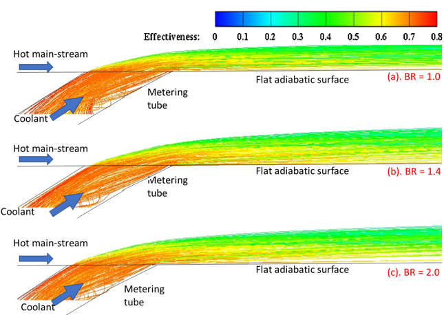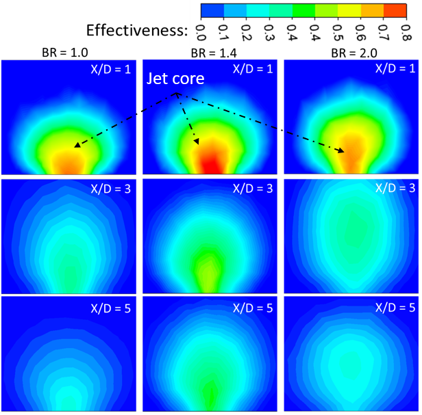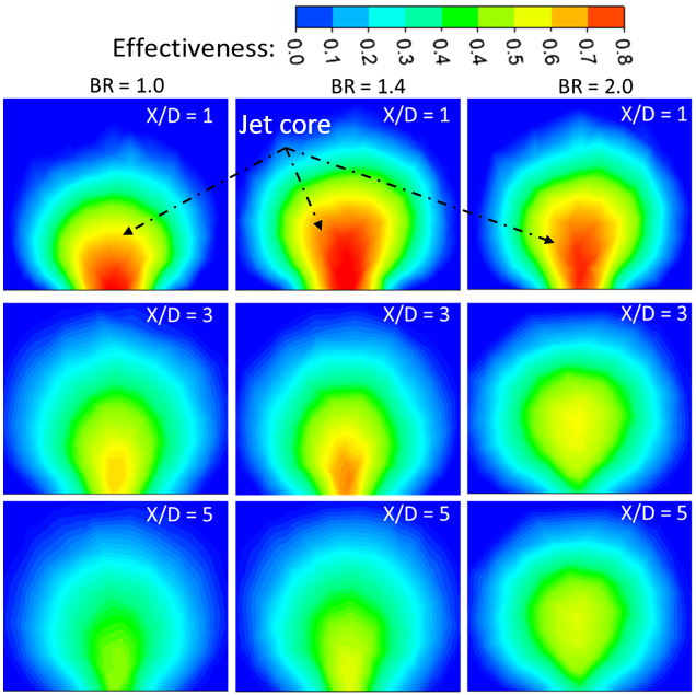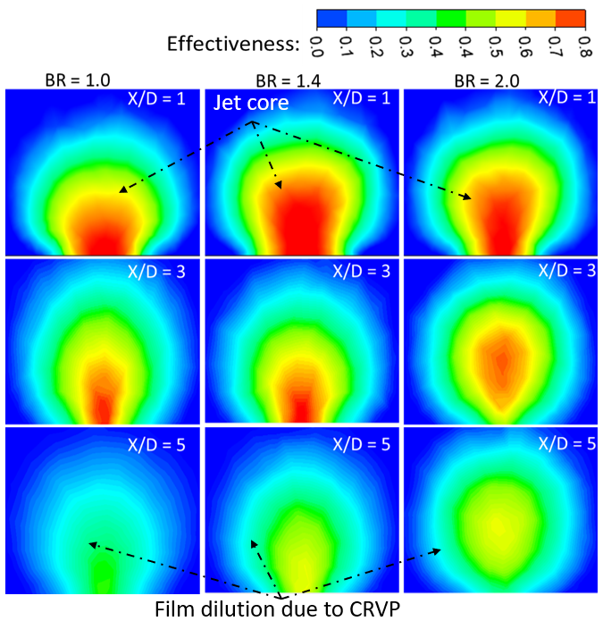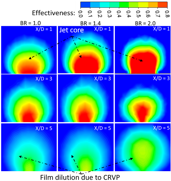 - A lower BR of 1.0 maintains sufficient momentum for effective droplet evaporation, enhancing cooling performance and benefiting better area-averaged effectiveness at Cm = 10%.
