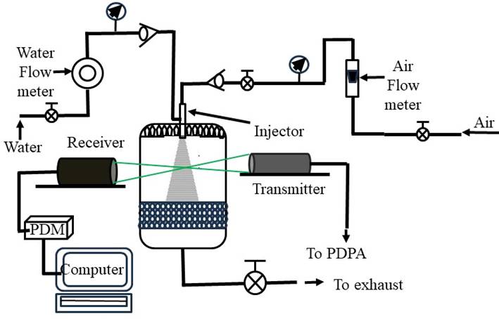 The twin-fluid atomizer used in this study is shown in Fig. 1 and comprises two nozzle configurations—one with three orifices and another with four orifices. Water and air were used as the working fluids. A 6 mm diameter central tube supplies water to the injector, with two 2 mm diameter ports at its end directing flow into the assembly. Surrounding this, a 12 mm diameter outer tube supplies air. To accelerate the airflow, a jet plate with four 1.5 mm diameter holes is installed inside the air passage. Additionally, two 2 mm diameter holes located 18 mm upstream of the central tube exit allow a small amount of air to enter the water stream, enhancing liquid acceleration. At the exit, an impactor plate induces primary breakup of the liquid jet. The resulting droplets are carried downstream by the high-speed airflow and exit through six rectangular slits (4.5 mm × 2 mm each) arranged around the impactor plate to form the spray. The fully assembled injector is mounted vertically at the top of a spray chamber (0.75 m × 0.75 m × 1.25 m), which provides optical access for PDPA measurements (Fig. 2). A honeycomb structure at the chamber base suppresses mist formation and prevents interference with the optical diagnostics. The water is supplied from a pressurized tank using compressed air, with flow controlled by a pressure regulator and monitored by a rotameter. Air is provided from a high-pressure laboratory line, regulated and monitored by a needle valve, pressure controller, and rotameter. Pressure corrections were applied using a gauge with ±1% full-scale accuracy to account for density variations.