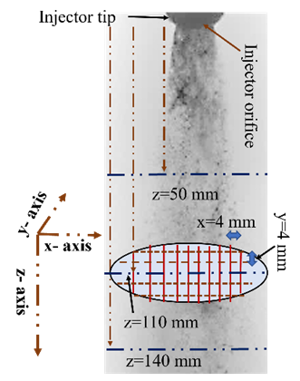 The spray characterization was conducted under independently controlled air and water flow rates to systematically evaluate the influence of operating parameters. Two water flow rates and three airflow rates were selected for each injector configuration. Detailed operating conditions for the 3-hole and 4-hole twin-fluid injectors are provided in Table 1 and Table 2, respectively. While the two injectors differ slightly in their total exit areas, the variations in flow parameters were minimal and did not significantly affect the comparative analysis. Droplet size and axial velocity were measured using a Phase Doppler Particle Analyzer at multiple axial and radial locations. Measurements were performed both along the spray centerline and across a defined transverse plane. Along the centerline, data were acquired at 10 mm intervals starting from 10 mm downstream of the nozzle exit, extending up to 180 mm. To capture the spatial distribution of the spray at a fixed downstream location, cross-sectional measurements were carried out at 110 mm from the nozzle exit over a grid spanning x = –24 mm to +24 mm and y = –20 mm to +20 mm, with 4 mm spacing in both directions. The measurement domain and grid layout are shown in Fig. 3.