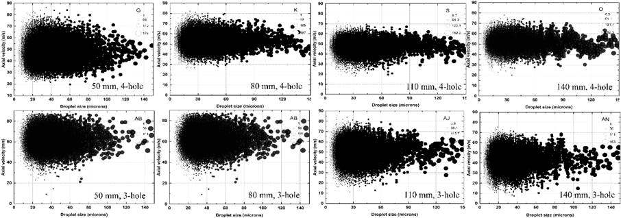 In contrast, the 3-hole injector produces a broader range of droplet sizes and velocities, with a higher presence of large droplets (>80 μm), particularly at 110 mm and 140 mm. These larger droplets exhibit slower breakup and retain more momentum, suggesting weaker interaction with the surrounding airflow and lower atomization efficiency. Although both injectors initially generate a dense cloud of fine droplets near the nozzle (at 50 mm), the difference in spray evolution becomes more apparent further downstream. At 110 mm, the 4-hole injector continues to maintain a uniform distribution, while the 3-hole injector shows growing dominance of coarser droplets. By 140 mm, the large droplets (>100 μm) from the 3-hole injector still retain significant velocity, while in the 4-hole case, velocities taper off more smoothly—implying more efficient momentum dissipation and improved mixing.