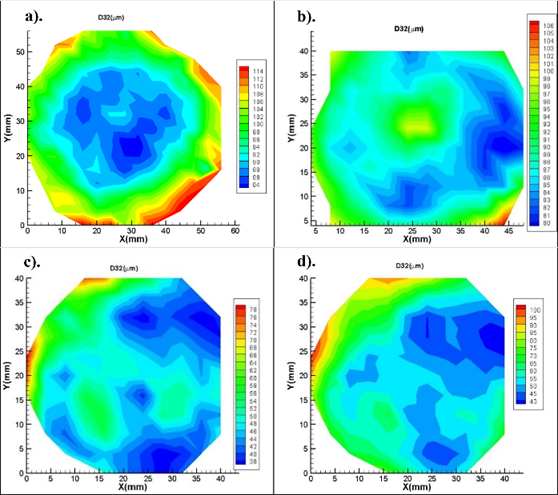 - The droplet size distribution across the spray section followed a lognormal trend, while velocity distribution showed no specific statistical pattern.