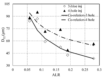 was used, where a and b are empirical constants obtained through regression analysis. In this model, a represents the pre-exponential factor that determines the baseline droplet size, while b indicates how sensitively the droplet size responds to changes in ALR. A more negative b implies a steeper decrease in droplet size with increasing air assistance, reflecting more efficient atomization dynamics. The values of these constants differ significantly between the two injector geometries, highlighting the impact of design on atomization performance. As presented in Table 3, the 3-hole injector yields a power-law coefficient a = 18.23 and an exponent b = –0.57, with a high coefficient of determination (R² = 0.916), indicating a strong correlation between ALR and D₃₂. In contrast, the 4-hole injector exhibits a larger a = 34.73 and a less steep exponent b = –0.35, with a lower R² value of 0.71, signifying weaker sensitivity to ALR and reduced model fit. These differences align with the physical observations. The 3-hole injector, due to its wider jet spacing and improved air access, is more responsive to changes in ALR and consistently produces finer droplets across all operating conditions. The steeper slope of its fitted curve confirms that even modest increases in air flow significantly enhance droplet breakup. On the other hand, the 4-hole injector demonstrates a flatter slope and larger droplet sizes overall, suggesting limited responsiveness to increased air momentum, particularly at higher ALRs. This may be due to denser jet interactions and less effective air entrainment, which hinder the breakup process