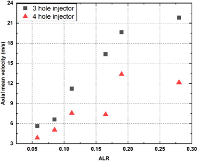 - Section-averaged analysis at 110 mm downstream showed that SMD decreased and mean axial velocity increased with rising ALR for both injector types.