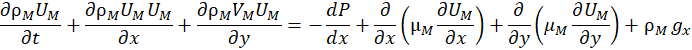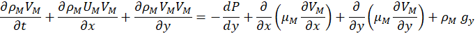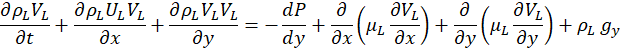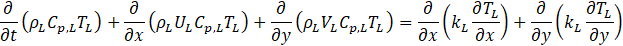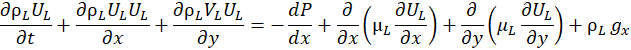 The flow is laminar, Newtonian, steady, and incompressible. The 2-D governing equations are formulated in x-y Cartesian coordinates, with x denoting the stream-wise direction and y the transverse direction. In the liquid phase, the governing system of equations can be written as follows: