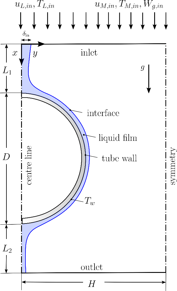 The domain of falling liquid film over a horizontal tube is shown in Figure 1. A thin liquid flows on the tube surface exposed to a uniform temperature, and a gas stream flows downwards in the vicinity of the film. As the liquid film flows over the surface, its thickness decreases due to the evaporation of the liquid. As the problem is symmetric, only a half of the tube is modelled. The tube wall region is not modelled.