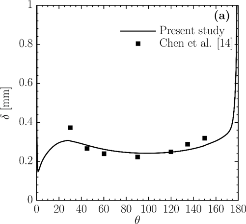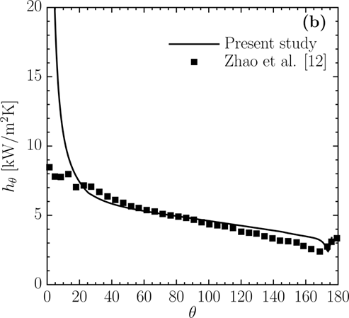 Figure 2a demonstrates the comparison of the liquid film thickness along the circumferential angle with the previous experimental study [14]. As seen in this figure, the results agree well with the experimental data. The local heat transfer coefficient compared with the numerical results presented in Zhao et al. [12] in Figure 2b. There are some differences close to the top of the tube, which can be due to the greater spatial resolution used in the code simulations. In addition, oscillations were observed in the results of Zhao et al. in that region. Over the rest of the domain, however, the present results are consistent with those in the previous numerical study. Based on the two comparisons, it is concluded that the present model reasonably represents the characteristics of the system.
