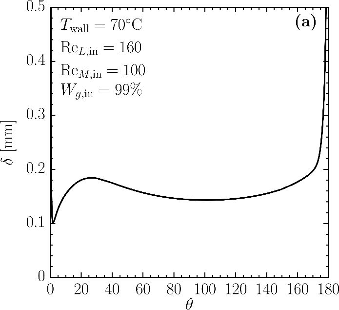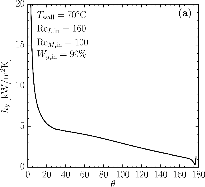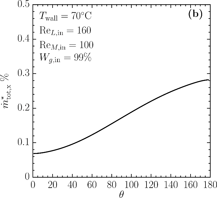 is the inlet mass flow rate per unit depth. Figure 4b depicts the total relative mass flow rate over the circumferential angle. As the liquid film flows over the tube surface, the mass leaves the falling film through the interface and is added to the gas phase as water vapour. For the practical applications, tube bundles are usually used instead of a single tube to maximize the amount of evaporated liquid and heat transfer in the system.