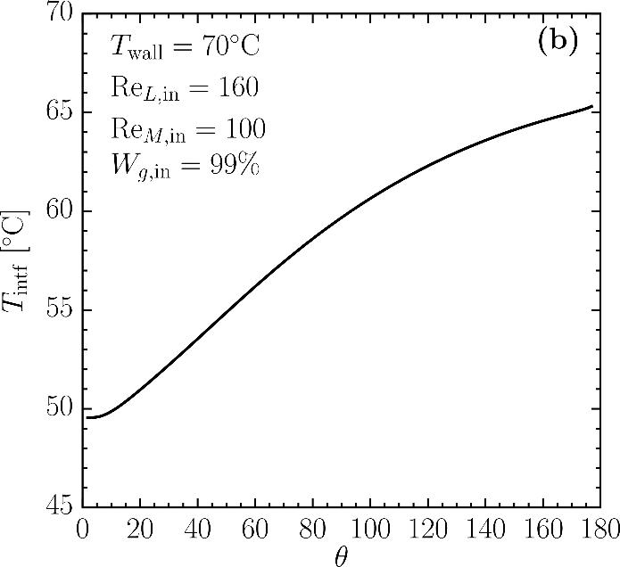 The parameters utilized in the parametric study simulation include: D=14 mm, H=114.3 mm, L1= 7 mm, L2=127 mm, ReL,in =160, ReM,in =100, TL,in =50℃ , TW =70℃ , TM,in =50℃ , Pref,in =1 atm, and Wg,in = 0.99. Figure 3a demonstrates the liquid film thickness over the circumferential angle. Film thickness is defined as the normal distance between the tube surface and liquid-gas interface; therefore, it goes to infinity at the top and bottom of the tube. For circumferential angles less than 5° , it decreases sharply, and then, it thickens up to 25°. After that, the thickness gradually decreases until reaching a local minimum value at around 100°. Figure 3b depicts the interfacial temperature along the circumferential angle. The temperature is increasing because the surface temperature is higher than that of the liquid film. Energy is transferred as sensible heat from the tube surface to the liquid film which leads to the interface temperature increase along the circumferential angle.