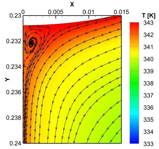 Figure 5 depicts the flow streamlines at the bottom of the tube. In this figure, the x and y axes have been scaled by dividing their values by the total length (L1+D+L2) and width (H) of the domain, respectively. As seen in this figure, a recirculation zone is formed at the lower stagnation point in the liquid film, affecting the heat transfer in that region.