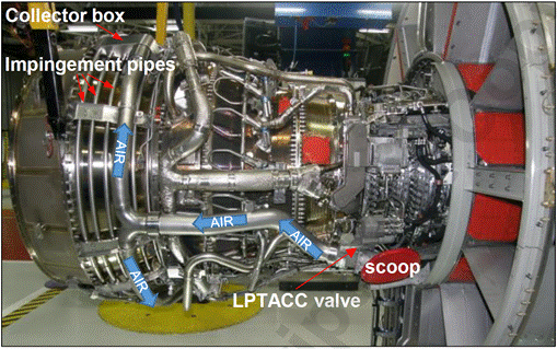 Figure 2 Perforated tubes (impingement pipes) used to cool down the low-pressure gas turbine casing in a jet engine [10].