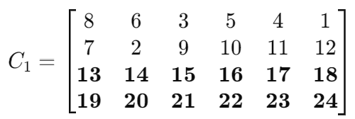 To validate the proposed reconfiguration algorithm, simulations were performed on a 4 × 6 PV array using a PV array model developed in MATLAB. The maximum power outputs for both the baseline configuration and the reconfigured arrangement were obtained to evaluate the performance improvement. Table 1 shows the per-unit values of the PV modules before reconfiguration, while Table 2 presents the array after reconfiguration. As shown, the modules are redistributed in a way that groups weaker modules more effectively, thereby reducing mismatch losses at the string level.
