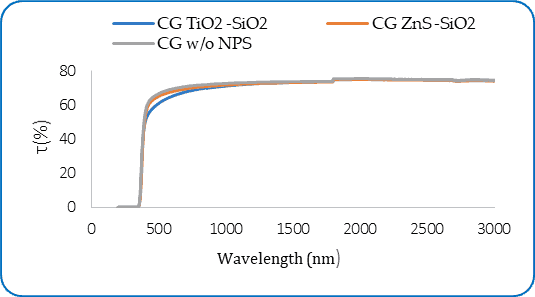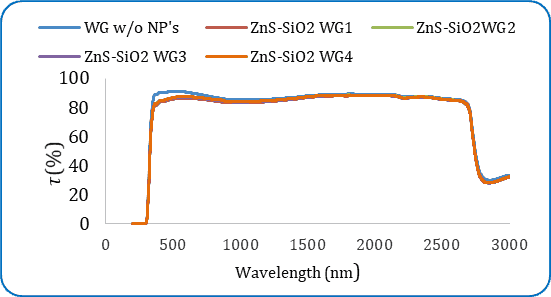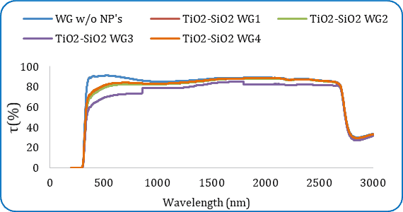 According to Figure. 10a, for the visible wavelength region, the best performing WG in terms of higher transmittance is WG without NPs, 𝜏 = 90.26%. However, WG3 with TiO2-SiO2 NPs has lowest 𝜏 = 69.62% is more effective in limiting transmission in the SW region.