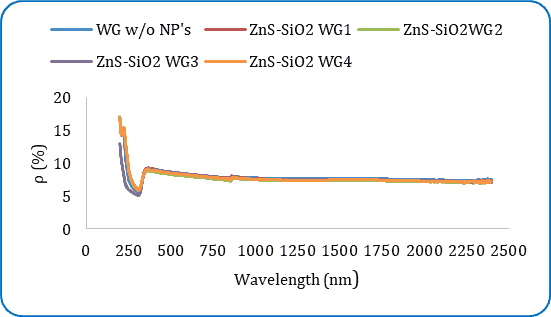 Therefore, Spectrophotometry (Lambda 1050+ UV/Vis/NIR Spectrophotometer) analysis has been performed on all the WG samples focusing on how TiO2-SiO2 and ZnS-SiO2 NPs reflect SW radiation. This assessment is informative and helpful for understanding the daytime PRC system design strategies. By analyzing
