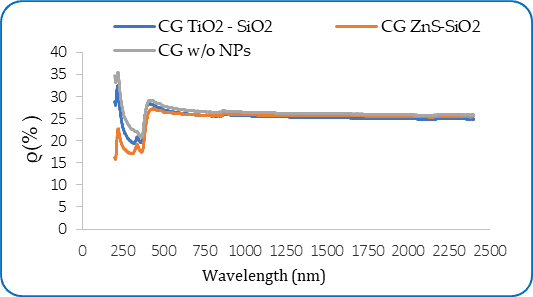 In case of, the CG® glass (see Figure 9c) with TiO2-SiO2 NPs exhibits a ρ = 3.07%, indicating a moderate level of reflectance. Similarly, the CG® glass with ZnS-SiO2 NPs shows a slightly increased effect with ρ = of 4.71%, suggesting a somewhat higher reflectance. Overall, both NPs demonstrate an ability to reflect a portion of incident light in visible spectrum.