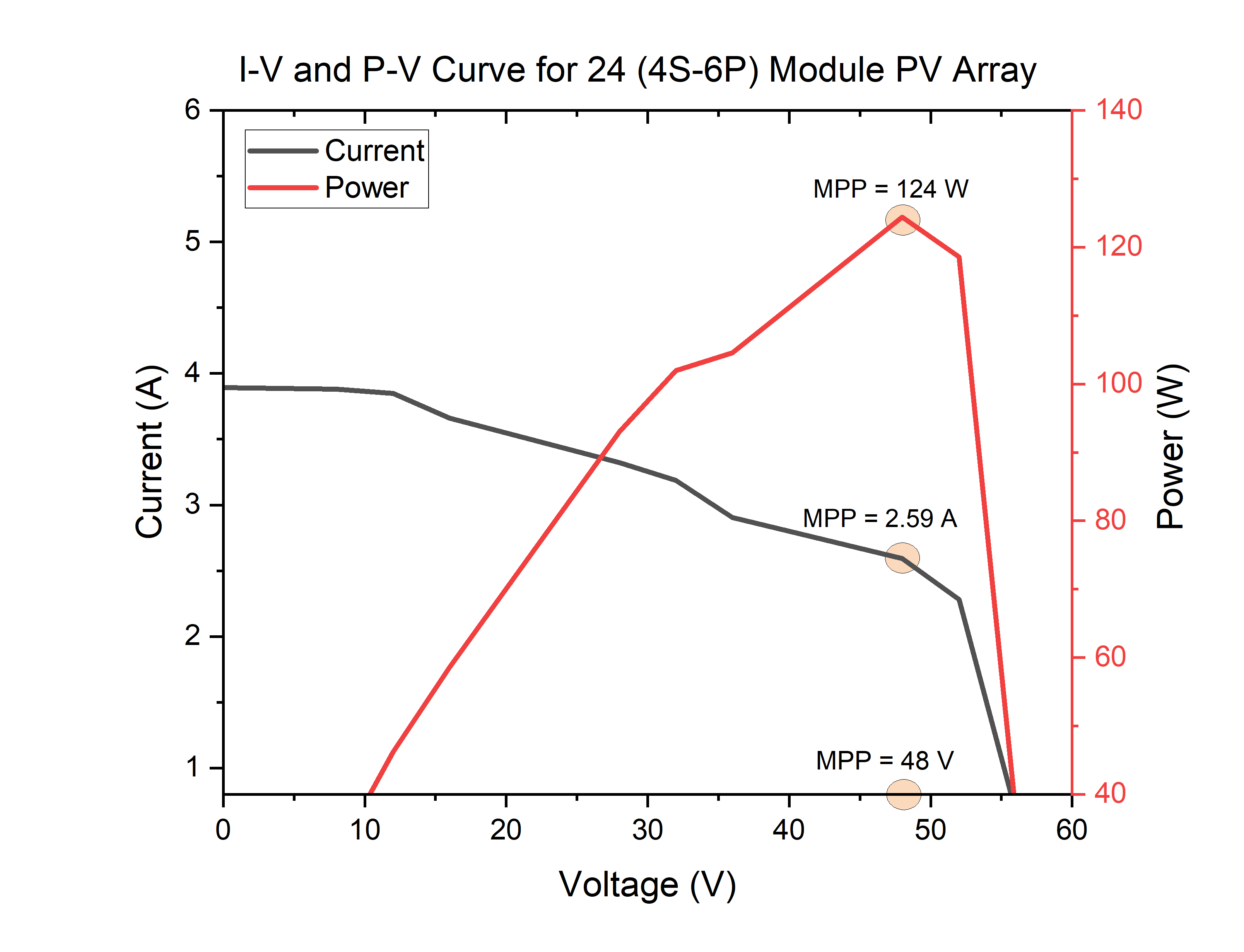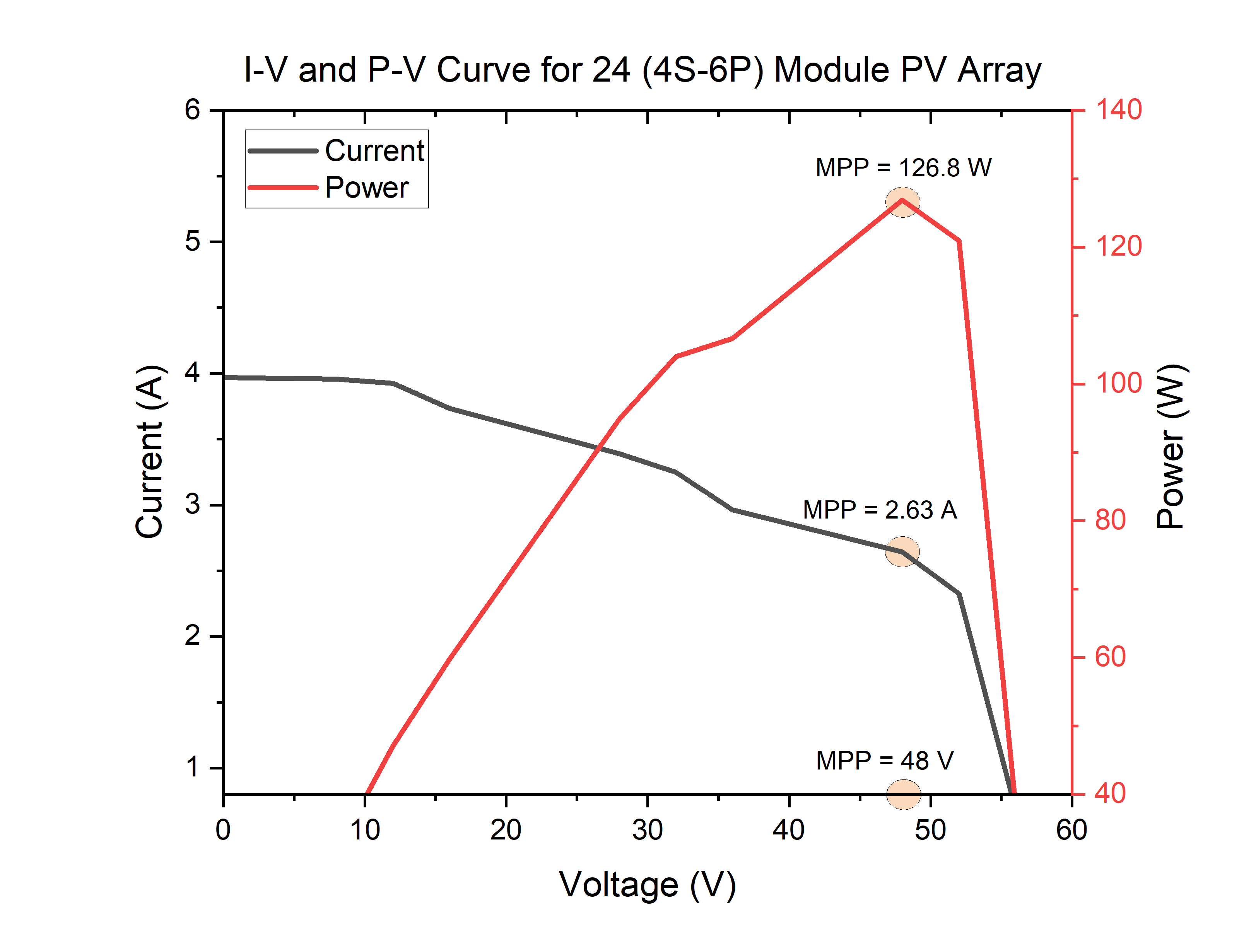 The results demonstrated that the algorithm effectively reduced the impact of mismatch among PV modules through a process known as 'reconfiguration'. After this reconfiguration, the array current at the global maximum power point increased from 2.59 A to 2.63 A, while the voltage remained constant at 48 V. Consequently, the power output improved from 124.4 W to 126.8 W, corresponding to a relative gain of 1.93%. Although modest, this improvement aligns well with gains reported in recent literature and confirms the ability of reconfiguration strategies to enhance array efficiency without requiring additional hardware.