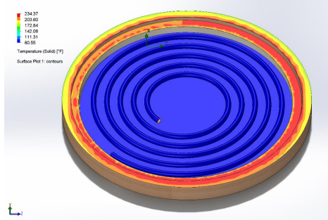 Figure 6 shows the temperature contour, which illustrates the temperature increase of the water as it passes through the solar collector, reaching a maximum of 234°F.
