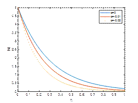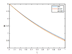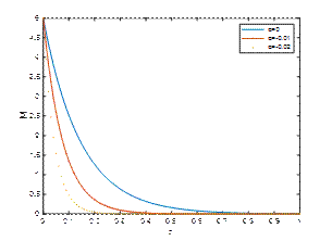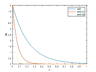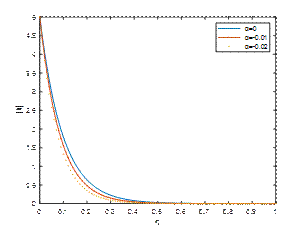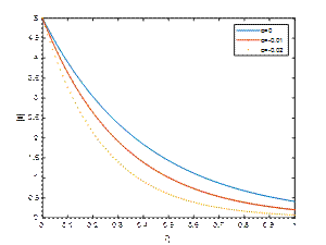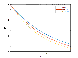 Fig. 1, Fig. 2 and Fig. 3 reveal |𝑢| against η for M1=2, Κ=2, 𝑡=𝜋/2 and λ=1,5,10 respectively. It is observed that the velocity of the fluid is diminished with a rise in the absolute value of the viscoelastic parameter α. An increase in the suction parameter λ enhances the velocity profile in the Newtonian case due to the thinning of the boundary layer and improved momentum diffusion. However, in non-Newtonian fluids, particularly shear-thinning types, an increase in suction tends to suppress the velocity profile, as the nonlinear rheology counteracts the boundary layer thinning effect.