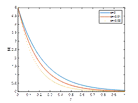 The Hartmann number M1 is a dimensionless parameter that characterizes the influence of a transverse magnetic field on a conducting fluid. The magnetic field suppresses oscillations and fluctuations, acting as a stabilizing agent in unsteady viscoelastic flows. Fig. 4, Fig. 5 and Fig. 6 demonstrate |𝑢| against η for Κ=2, λ=5,𝑡=𝜋/2 and M_1=10,15,20 respectively. It is observed that the velocity of the fluid decreases with the rise in the absolute value of the viscoelastic parameter α. The velocity profile is observed to be diminished with the increase of the magnetic field parameter M1.