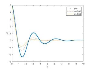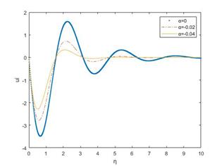 As η increases, Fig 10 and Fig 11 show an oscillatory decay, i.e., the amplitude of oscillations decreases with increasing η, tending toward zero. In both the real and imaginary parts of the velocity profile, it is observed that they increase as the viscoelastic parameter α increases together with an oscillatory decay. The flow becomes less oscillatory and approaches zero more rapidly, possibly indicating viscous dissipation. Similar trends were observed for various values of the parameters involved in the solution, further validating the influence of the viscoelastic parameter α on the flow characteristics.