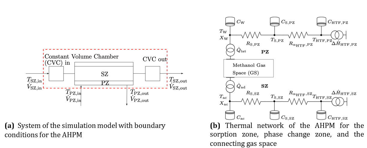 The adsorption heat pump module (AHPM), illustrated in Figure 1a, consists of a sorption zone (SZ, red) and a phase-change zone (PZ, blue), connected via a shared refrigerant gas space (GS).