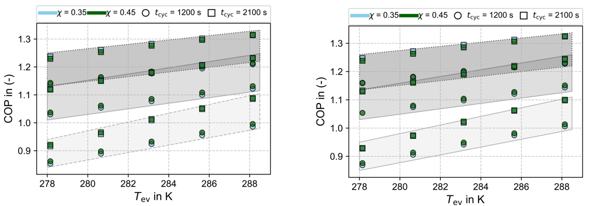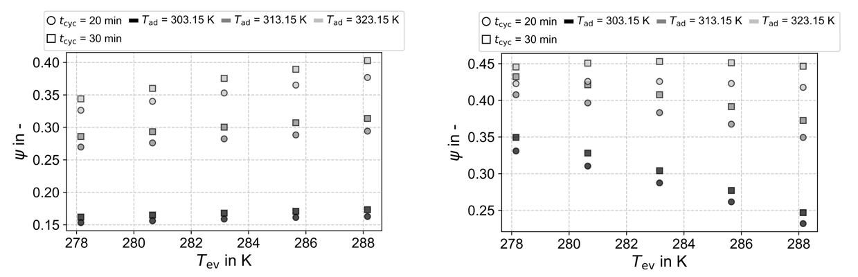 A parameter study is conducted with operating conditions chosen to reflect typical scenarios for building heating applications. The desorption temperature is fixed at Tdes= 388 K, while the adsorption temperature ranges from 303 to 323 K and the evaporation temperature from 278 to 288 K. HTF volume flow rates vary between 15 and 30 l/min, the desorption ratio χ between 0.35–0.5, and cycle times tcyc from 1200 to 2100 s.