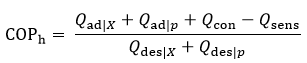 To evaluate the efficiency of the module, the coefficient of performance (COP) is calculated based on the integrated heat flows over a full operating cycle, rather than instantaneous power values. This approach is necessary because the heat pump operates in alternating, transient modes [20]. The heating COPh is defined by: