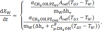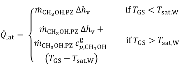 Eq. 6 distinguishes between evaporation (first case) and condensation (second case). In the condensation case, the second term accounts for the sensible heat associated with the superheated methanol vapor, where is the specific heat capacity of methanol vapor.