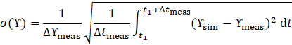 In this equation and correspond to the simulated and measured values, while and account for the difference of the maximum and minimum measured value and the time interval considered in the equation, respectively.