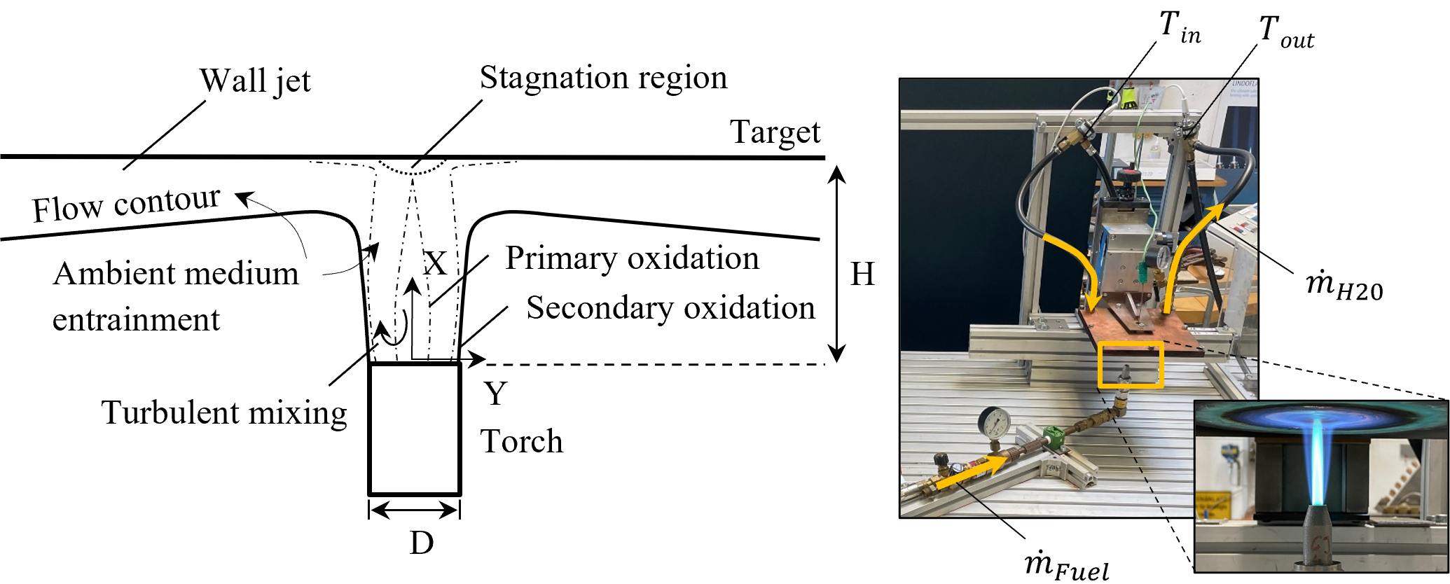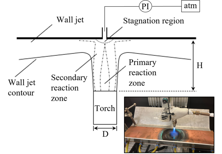 The experimental setup to assess the heat transfer efficiency/combustion efficiency as described in more detail by reference [9] uses a water-cooled calorimeter to evaluate the global heat transfer between a partially- premixed acetylene/air flame. Measuring the fuel gas and water flow rates as well as the in- and outlet temperatures of the coolant allows the computation of the combustion efficiency. The experiments determine the influence of the Reynolds number/firing rate and the torch-to-target distance on the heat transfer efficiency. The results of the study show good agreement with existing literature and confirm the setups' suitability for evaluating industrial flame heating processes and enhancement strategies [9]. Figure 1 shows the aerodynamic principles of DFI systems as well as a depiction of the test setup.
