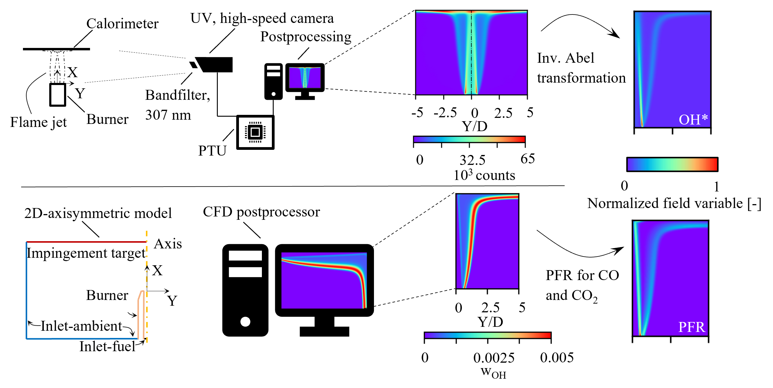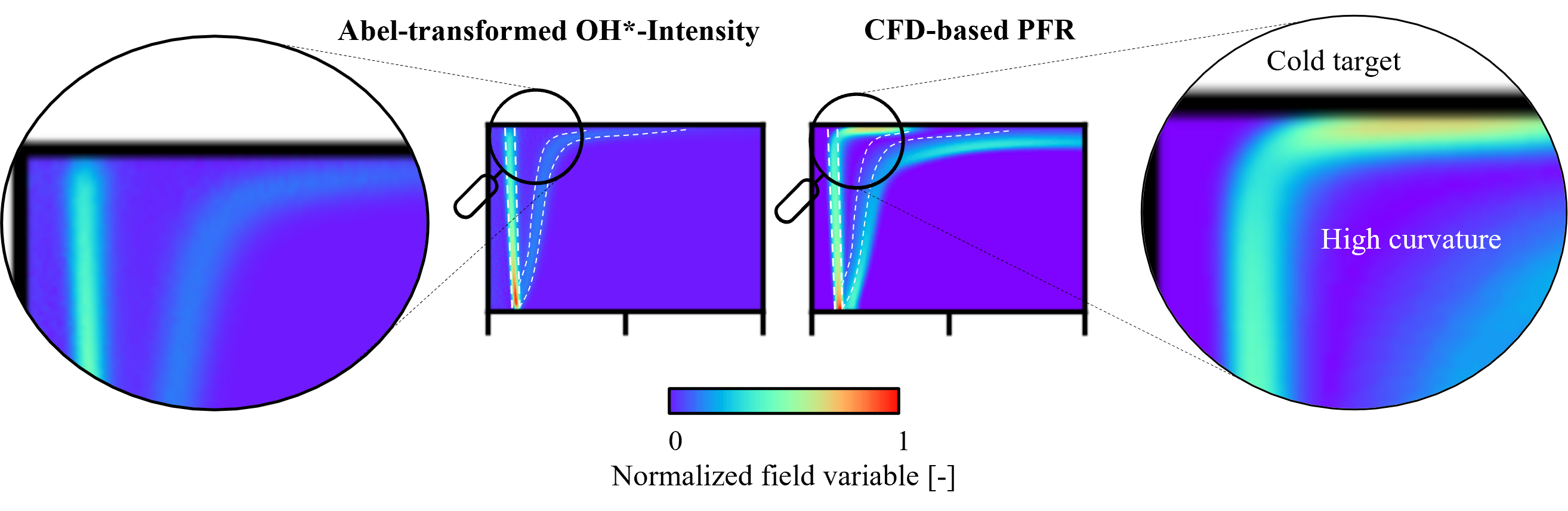 To address the remaining uncertainty about the numerical TCI description for the investigated partially- premixed, turbulent DFI systems, the visualization of OH* chemiluminescence in reference [13] investigates the flame structure and reaction zones for various flame configurations and torch-to-target distances. The inverse Abel transformation is employed to align the experimental line-of-sight images and the numerical results taken from a 2D-axisymmetric RANS setup (ω-based RSM with FGM reduction). The methods are visualized in figure 2. When compared to the experimental OH* intensity data, the numerical data shows good agreement between the flame structure and the predictions of (HRR) and especially the product formation rate (PFR) of CO and CO2 to also evaluate the secondary reaction front. The results show that while HRR correlates well with the OH* intensity in the primary oxidation zone, the PFR provides a better indicator for both reaction fronts. The study highlights the importance of PFR and HRR in assessing turbulence–chemistry interaction and flame structure and identifies discrepancies in the wall jet region as a key area for future research [13].