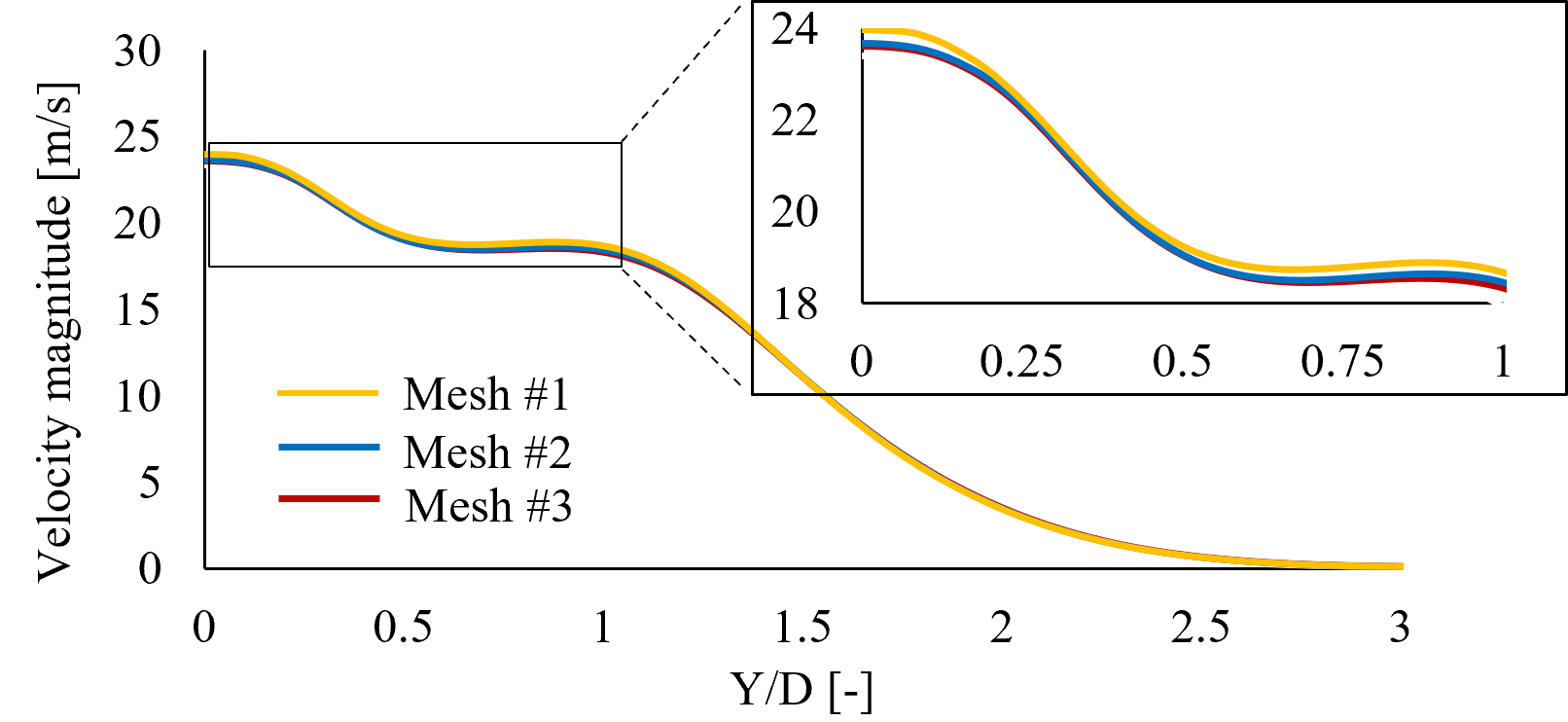 To cover mass flow, turbulence and reaction progress, the verification of the grid independence investigates the gradients of the velocity magnitude, the mean mixture fraction and the turbulent intensity for three meshes with an increasing element count (90, 165, 360 x 103 elements). The configuration H/D = 8 was used and the variables were taken at 85 %, 90 % and 95 % of H/D = 8. While a marginal difference was found for each variable at all distance fractions for the first mesh, mesh #2 and mesh #3 derive similarly resolved functions for the considered variables and for all distance fractions. Figure 10 shows an exemplary result of the independence study. Additionally, the heat flux from the flame into the target was taken as a global variable to assess the mesh independence for the main variable of interest. The difference in global heat flux for mesh #2 and mesh #3 the relative error is less than 1 %, for mesh #1 the deviation is 5 %. Based on the study, the solution is considered independent of the numerical grid. With respect to the results regarding the inadequately resolved flame extinction, all three meshes yield the same result and indicate significant heat release and product formation in the proximity of the target.
