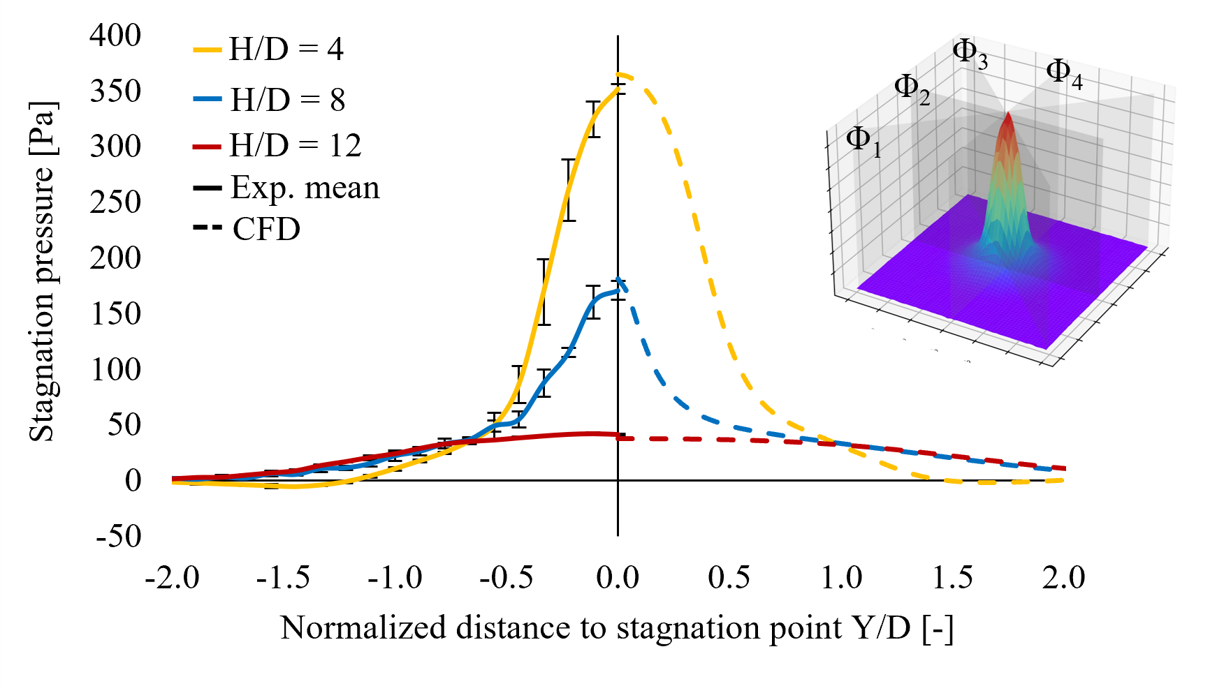 As the heat transfer is dominated by convection, the deviation between the experimental and the numerical combustion efficiency is likely driven by one of the fields directly related to the convective heat transfer- either by the temperature or the velocity field or some basic dependencies of these fields (compare equation 1). Consequently, the stagnation pressure may serve as an indication for the quality of the computation of one or more parameters/fields due to a potentially incorrect TCI model. Figure 5 depicts the result of the stagnation pressure measurements for the flame of Re=6000 for three different torch/target distances. While minor deviations are present, the numerically derived stagnation pressure is in good accordance with the experimental values. The experimental mean is calculated for four individual planes Φ1 - Φ4 (figure 4). The error bars are the corresponding standard deviation. Based on equation 1, the results also suggest a good prediction for the (axial) velocity and a good resemblance of the density field and its influencing parameters. The temperature-dependence is largely driven by the computation of the heat release rate within the flame. The species distribution is determined by an accurate description of the mixture fraction and the progress variable. Due to the accurate match between the numerically derived stagnation pressure distribution with the experimental one, the investigation does not yet allow a conclusion to explain the deviation in terms of the predicted heat transfer characteristics as depicted in figure 4. On the contrary, it suggests an accurate resemblance of at least the free jet and its transition by the proposed CFD model necessitating additional means of investigating the TCI. The results for Re=2825 and Re=9100 are of equally good quality.