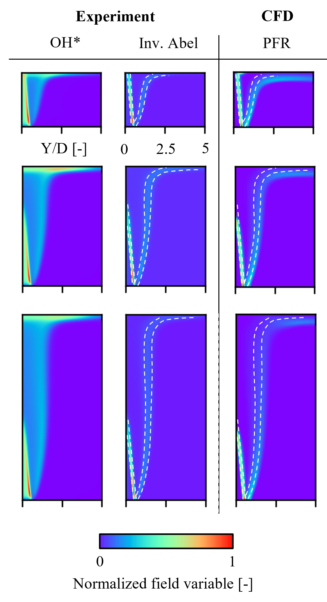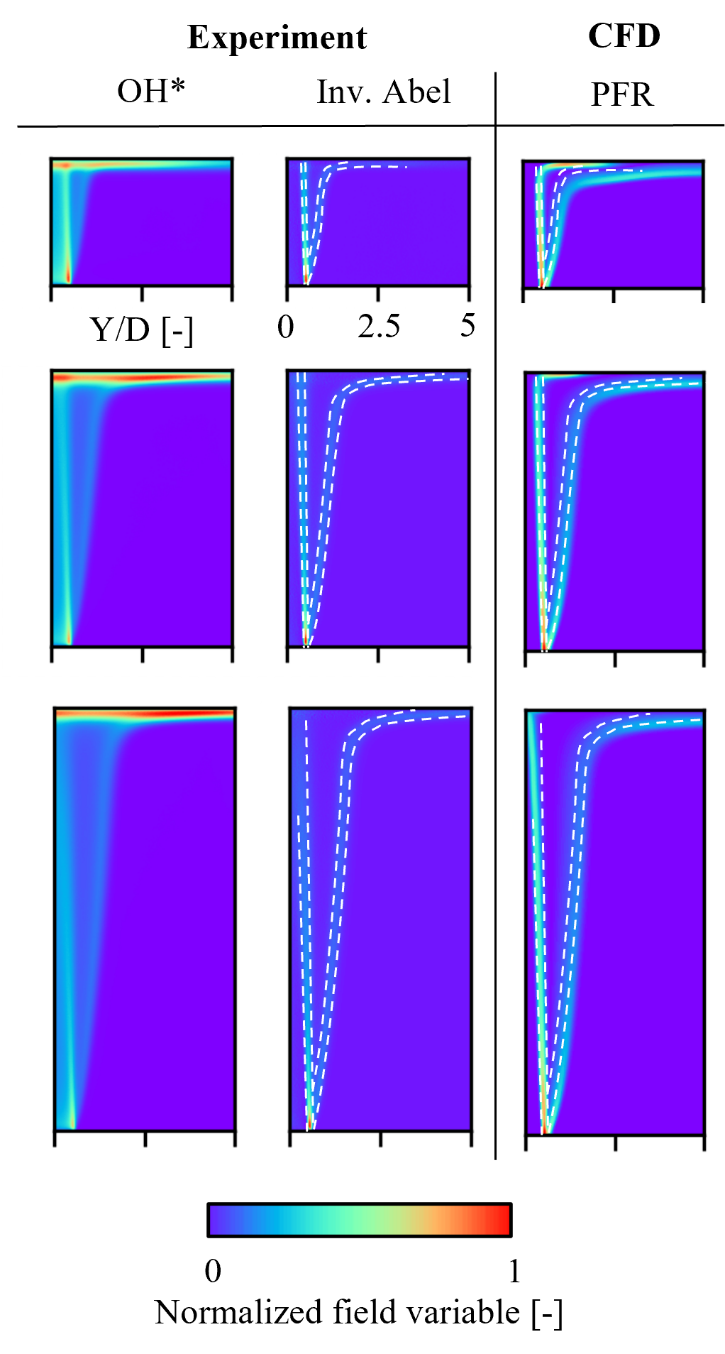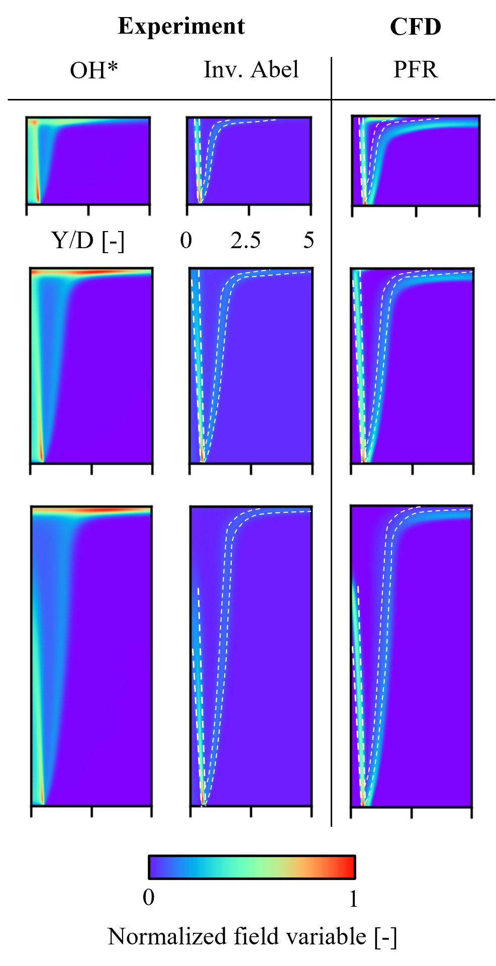 As the stagnation pressure measurements proves the computation of density and velocity fields in the free jet region to be accurate, the OH* intensity imaging method in the search for the deviation of the combustion efficiencies indeed delivers a possible explanation for the described deviations at low H/D values and for the increasing overprediction of combustion efficiency for flames of high firing rate. Figures 6 – 8 summarize the normalized OH* intensity plots alongside the respective numerical analyses (normalized PFR).