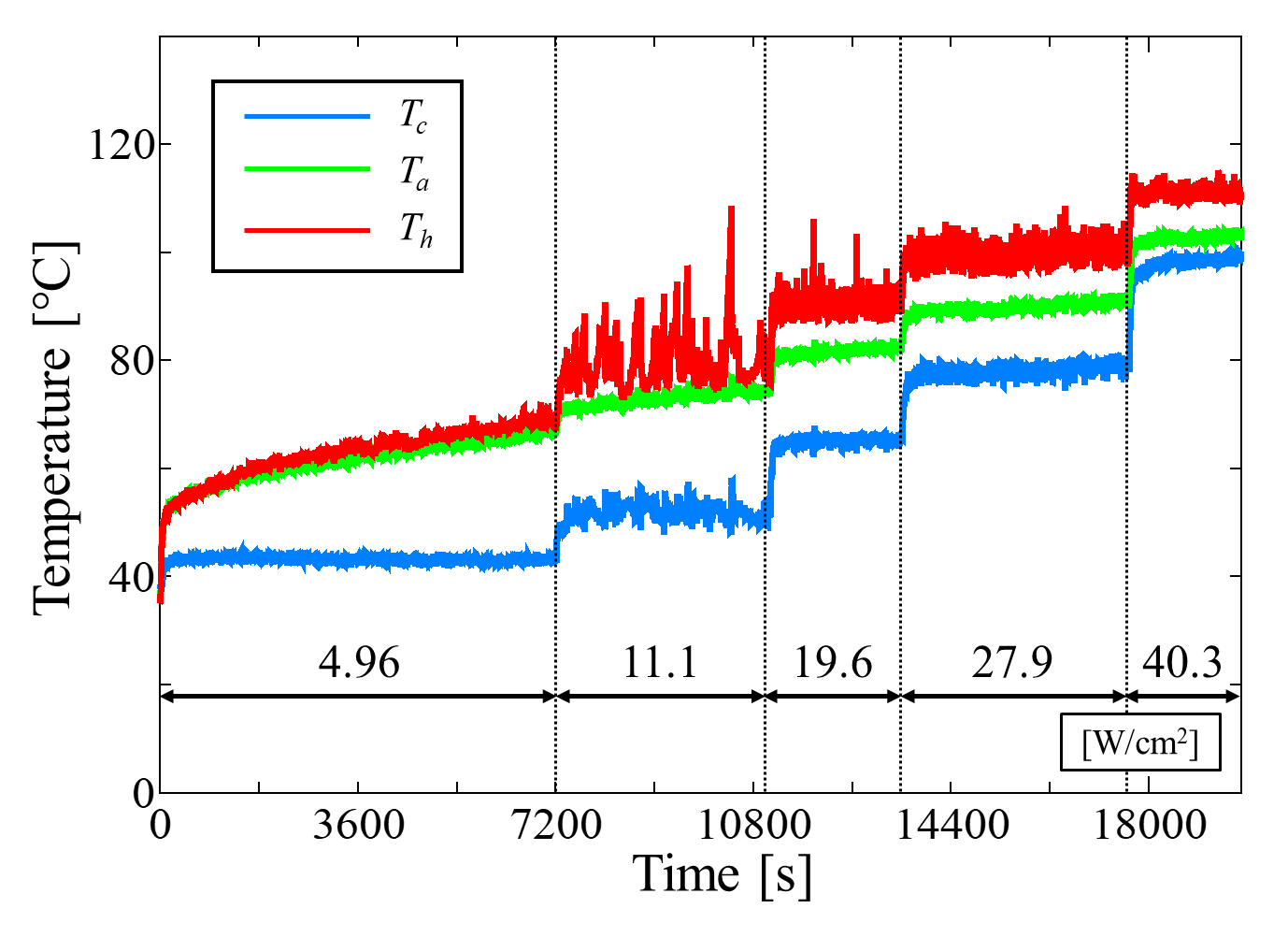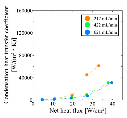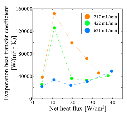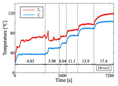 Figure 12 shows the temperature time histories obtained under water cooling, where the cooling water flow rate was set to 217 mL/min and 621 mL/min. In both cases, the inlet temperature of the cooling water was maintained constant at 40℃. The applied heat flux is also indicated in the figure. As shown in Figure 12, when the flow rate increased from 217 mL/min to 621 mL/min, the maximum allowable heat flux before the heating section temperature reached approximately 120°C increased by about 19%. On the other hand, at 621 mL/min, pronounced fluctuations were observed in the temperature profiles of both the heating and cooling sections. The largest temperature oscillations occurred under a heat flux of about 11 W/cm².