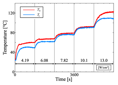 The applied voltage was then increased stepwise after confirming that the temperature measured by the thermocouples attached to the MLFHP had reached a steady state. Steady state was defined as the condition in which the temperature fluctuation in the heating section over a 5-min period, calculated from a moving average with a 1-min window, was within 1 K. For safety reasons, the experiment was terminated when the temperature in the heating section approached 120°C.