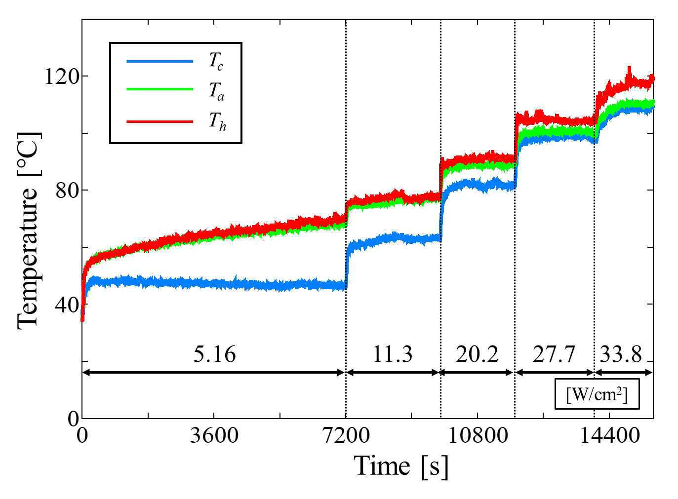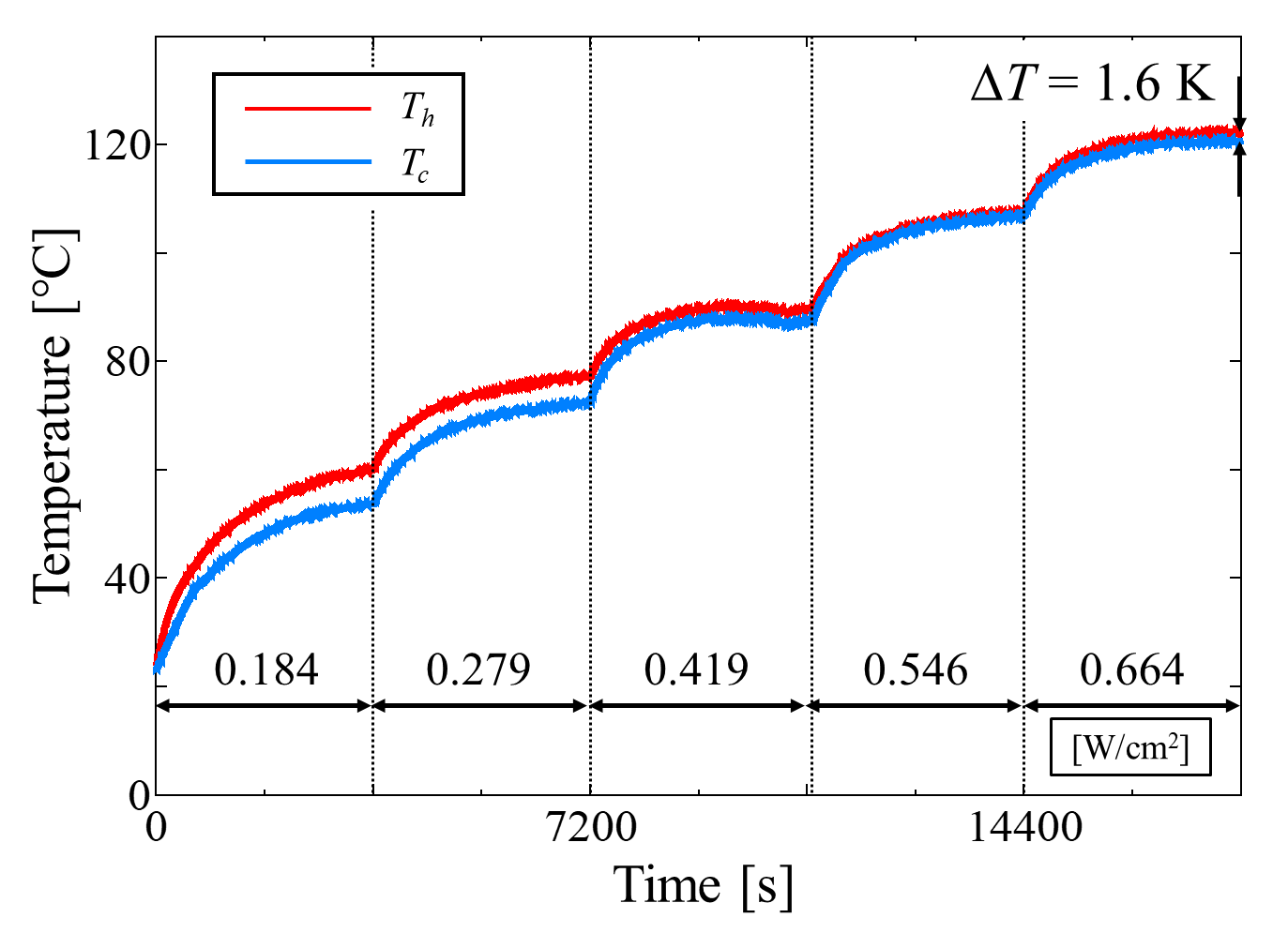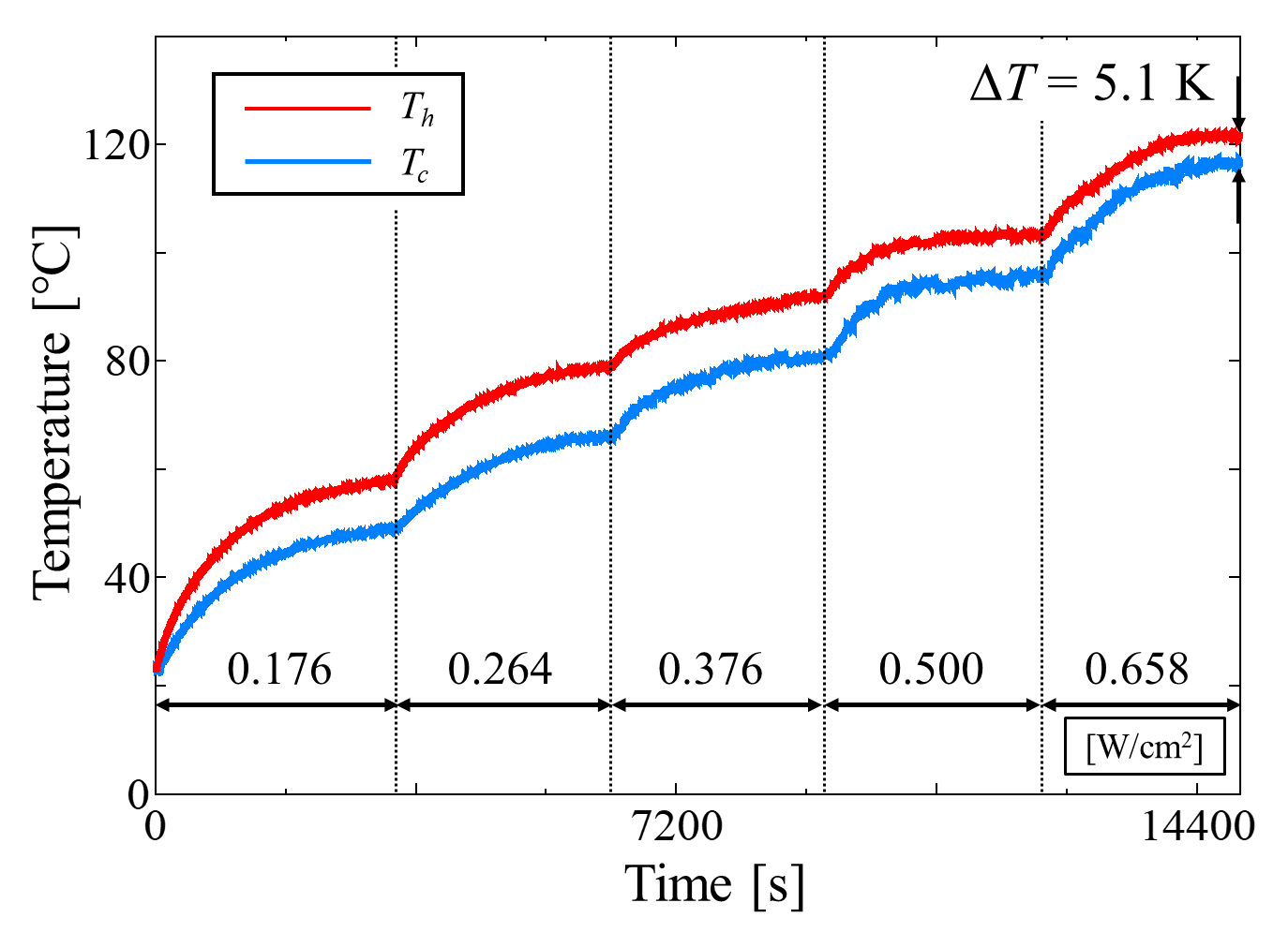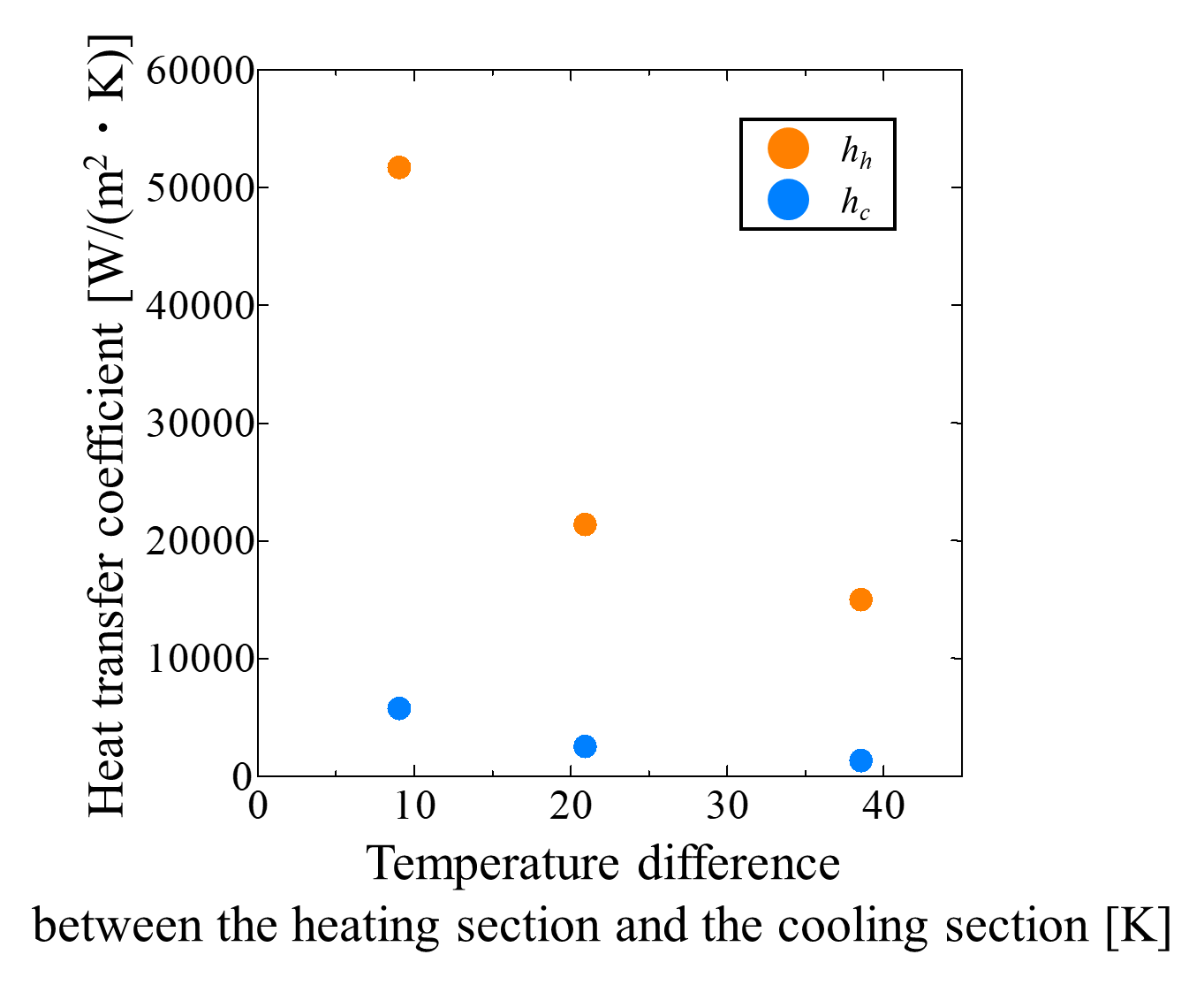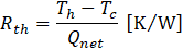 where qh (=Qnet⁄Sh ) and qc (=Qc⁄Sc ) represent the heat fluxes in the heating and cooling sections, respectively, and Sh and Sc are the surface areas of each section. Qc is the heat dissipation by the cooling water, calculated from the temperature difference between the inlet and outlet of the cooling water. ∆Th (=Th-Ta) and ∆Tc (=Ta-Tc) refer to the temperature difference between the heating and insulating sections and between the insulating and cooling sections, respectively. Th,Ta,and Tc are the average temperatures of the heating, insulating, and cooling sections, respectively.
