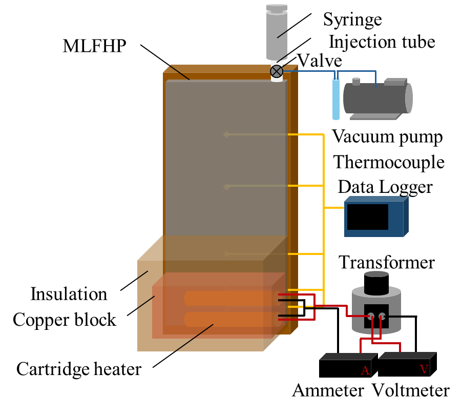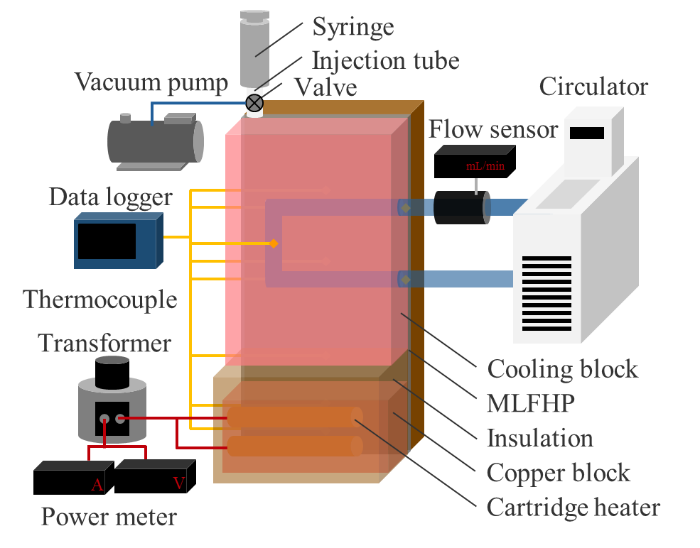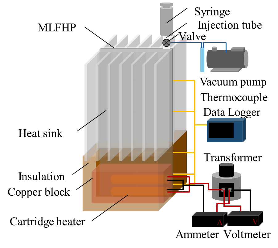 Figure 1 shows schematic diagrams of the experimental setup under three cooling conditions: natural air cooling, forced air cooling, and water cooling. The MLFHP was placed vertically, with the lower part of the channel serving as the heating section and the upper part as the cooling section. The experimental setup consisted of a heating system, a cooling system, a measurement system, a vacuum pump system with a digital vacuum gauge, and a syringe for filling the working fluid. The heating system comprised two cartridge heaters and a transformer. The heating load from the transformer was supplied to the heating section via the copper block into which the cartridge heaters were inserted. Under natural air cooling, the cooling system was open to the atmosphere. Forced air cooling was provided by a fan positioned perpendicular to the cooling surface, where heat sinks were attached. Under water cooling, cooling water from a high-low temperature circulator was circulated through the cooling block. The cooling water flow rate was controlled using a flow sensor. The entire system, except for the cooling section under air-cooling conditions, was covered with insulation material to minimize heat loss. In case of water cooling, the water block was also insulated. To reduce thermal contact resistance, thermal conductive grease was applied at the contact surface between the MLFHP and the heater block, as well as between the MLFHP and the heat sinks or cooling block. The temperatures were measured using K-type thermocouples attached to the MLFHP.